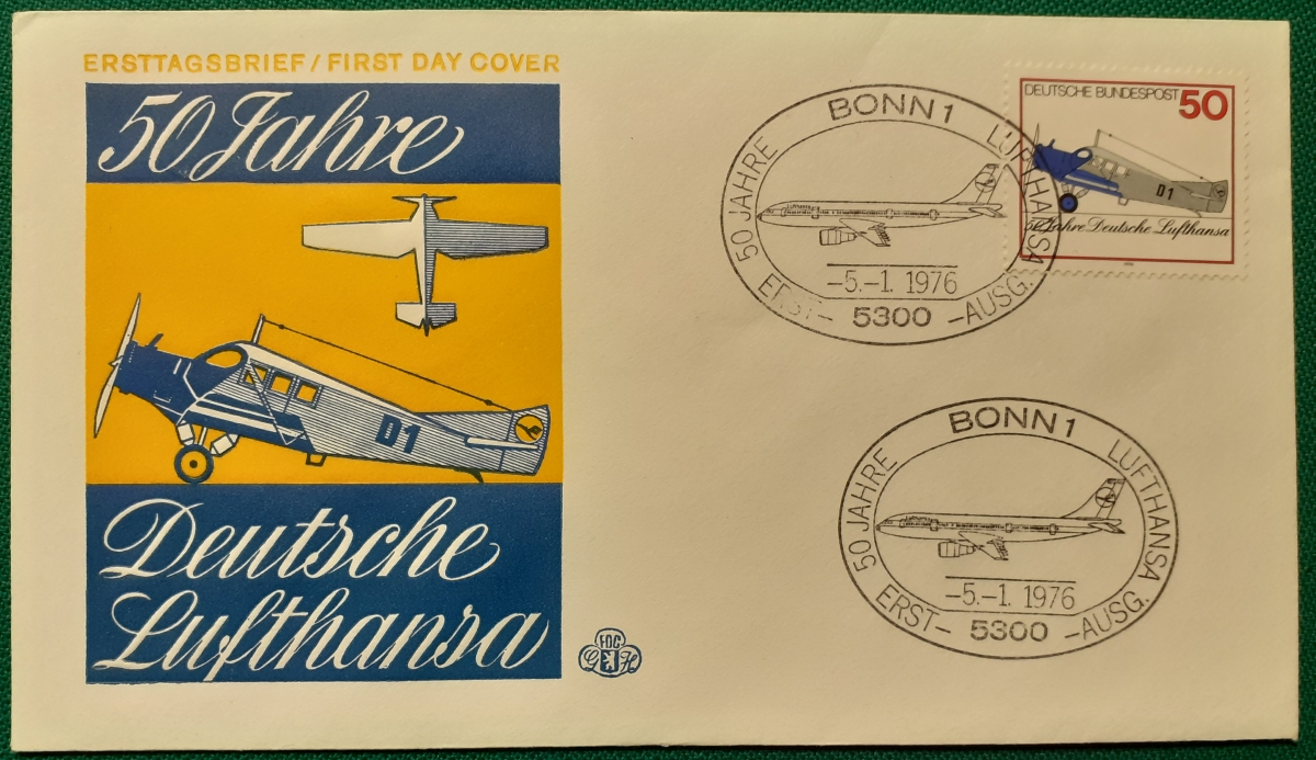 50 Jahre Deutsche Lufthansa 1976 Michel-Nr. 878 Offizieller Umschlag mit Ersttagsstempel; sehr guter altersgemäßer Zustand Preis: 3 EURO |
