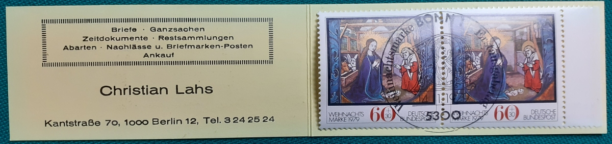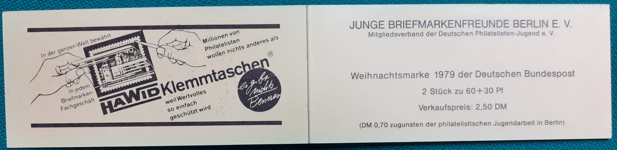 Privates Markenheftchen: Michel-Nr. 1032 Zwei Marken 60 + 30 Pf. mit Ersttagsstempel vom 14.11.1979; Werbungen: Christian Lahs, Philatelie; HAWID-Klemmtaschen; sehr guter altersgemäßer Zustand Preis: 4 EURO |