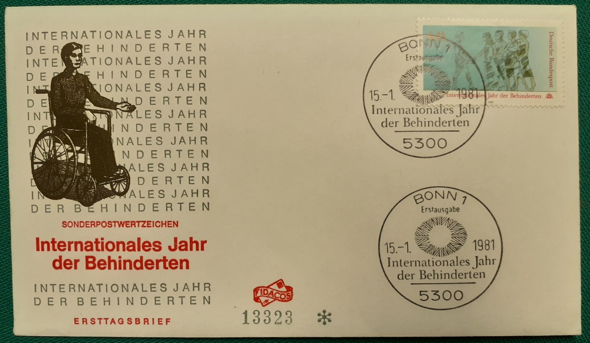 Internationales Jahr der Behinderten Michel-Nr. 1083 Offizieller Umschlag mit Ersttagsstempel; sehr guter altersgemäßer Zustand Preis: 3 EURO |