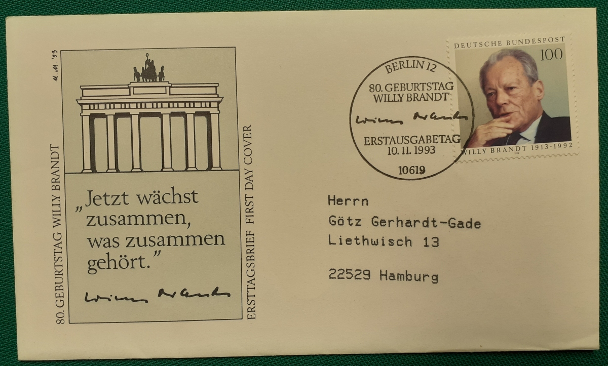 80. Geburtstag von Willy Brandt Michel-Nr. 1706 Offizieller Umschlag mit Ersttagsstempel; gelaufen von Berlin nach Hamburg; sehr guter altersgemäßer Zustand Preis: 2 EURO |