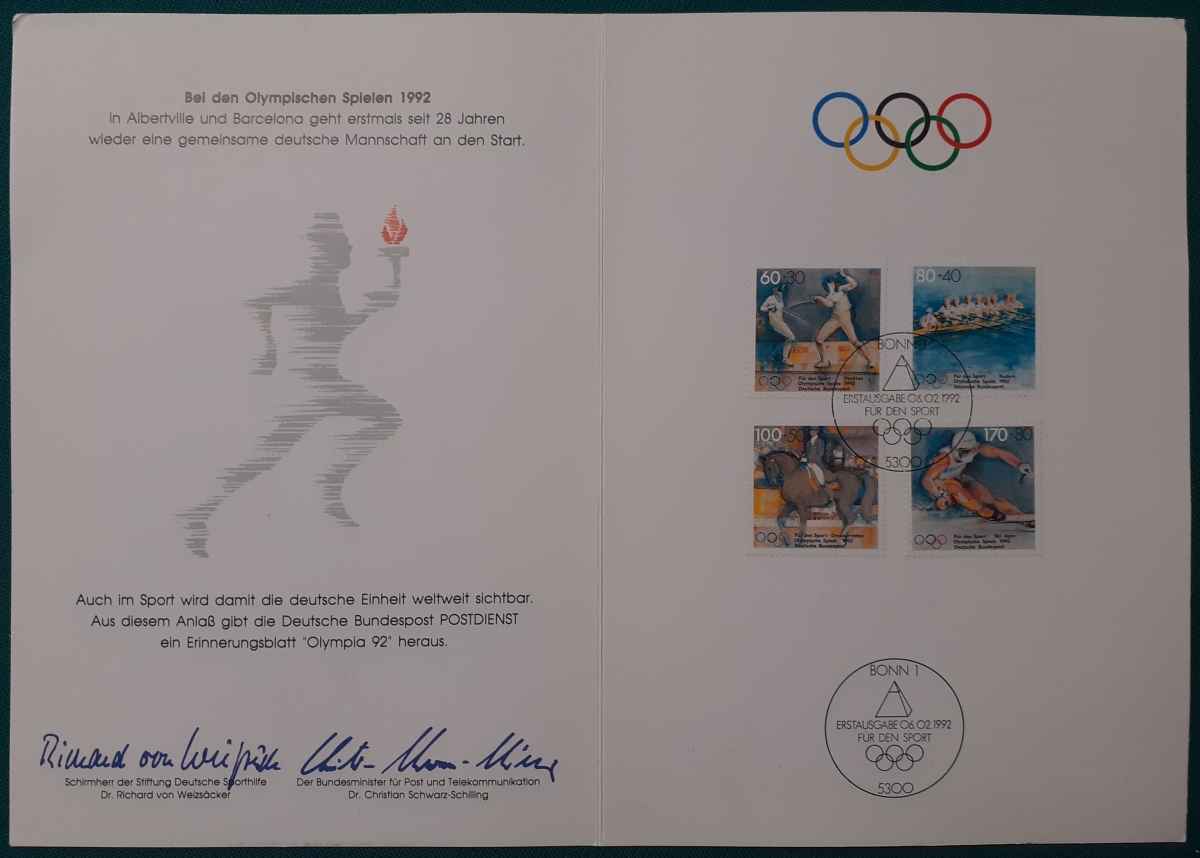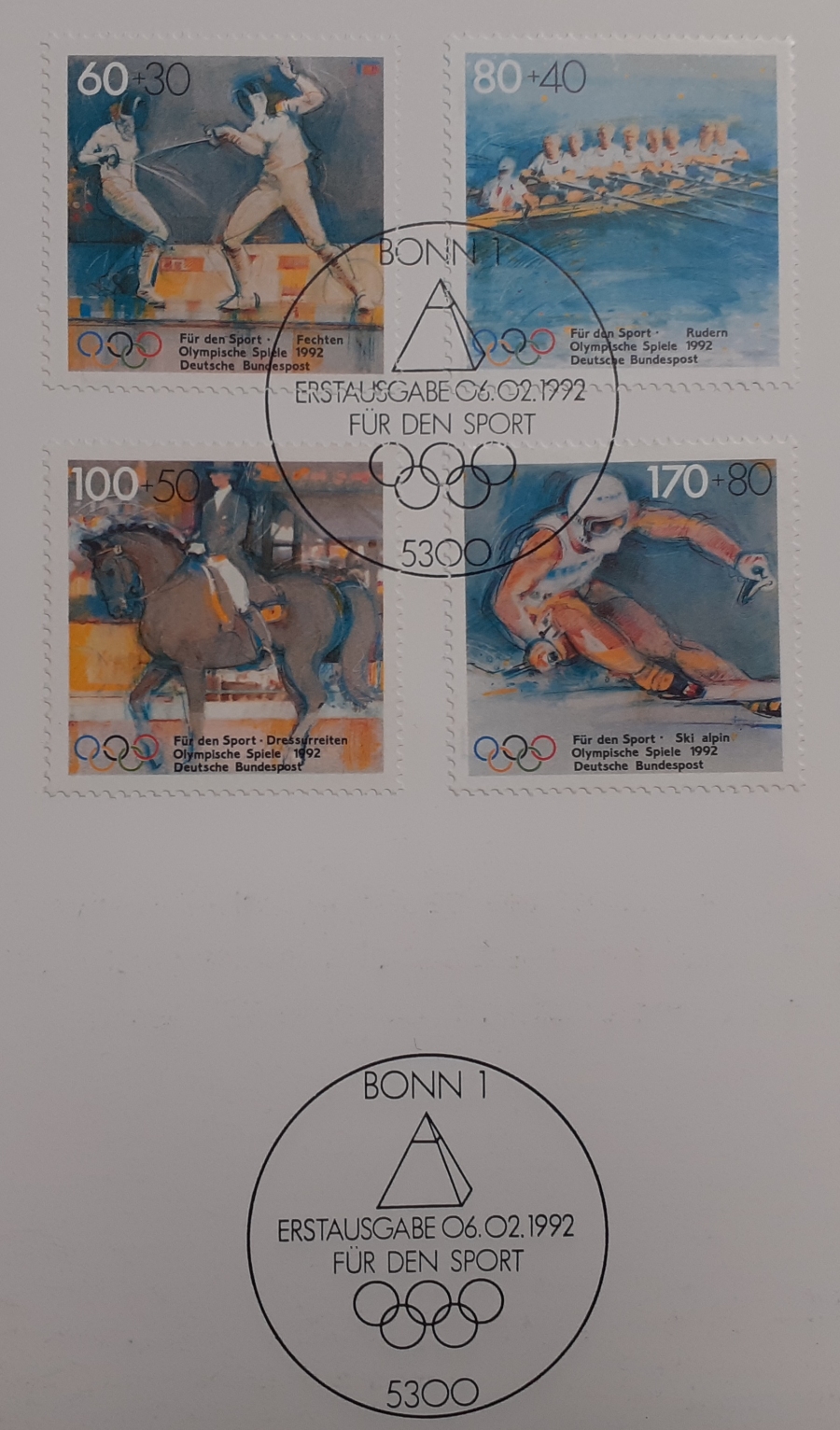 Wohlfahrtsmarken 1992: Für den Sport Michel-Nr. 1592 bis 1595 Erinnerungsblatt der Deutschen Bundespost "Olympia 92": Bei den Olympischen Spielen 1992 in Albertville und Barcelona geht erstmals seit 28 Jahren wieder eine gemeinsame deutsche Mannschaft an den Start; mit Ersttagsstempel; gelaufen von Berlin nach Hamburg; Außenseite leicht fleckig; sonst sehr guter altersgemäßer Zustand Preis: 5 EURO |