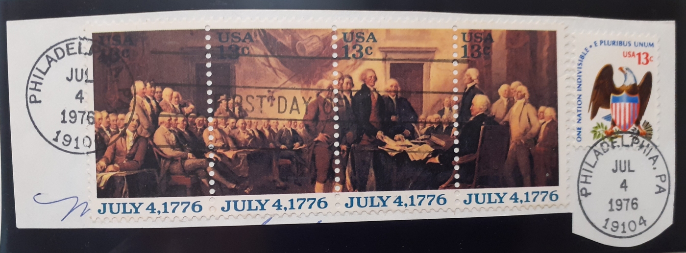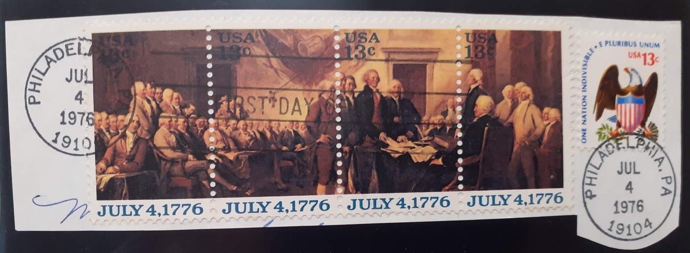 am 4. Juli 1776: Viererstreifen (Michel-Nr. 1278 bis 1281) mit Ersttagsstempeln; dazu eine weitere Marke mit dem Staatswappen 13 C (Michel-Nr. 1196 von 1975); guter altersgemäßer Zustand Preis: 8 EURO |