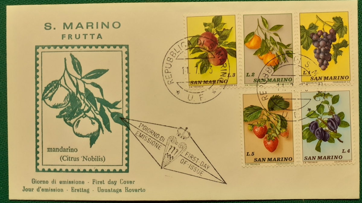 Ersttagsbrief: Umschlag im Format 16,5 x 9,5 cm den fünf Marken des Satzes "Früchte" mit Ersttagsstempeln; sehr guter altersgemäßer Zustand Preis: 2 EURO |