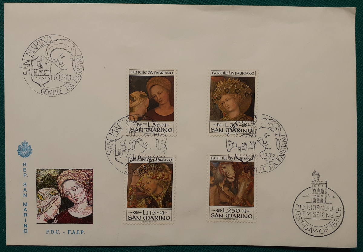 Ersttagsbrief: Umschlag im Format 20 x 13,5 cm den vier Marken des Satzes "Gentile da Fabriano" mit Ersttagsstempeln; sehr guter altersgemäßer Zustand Preis: 2 EURO |
