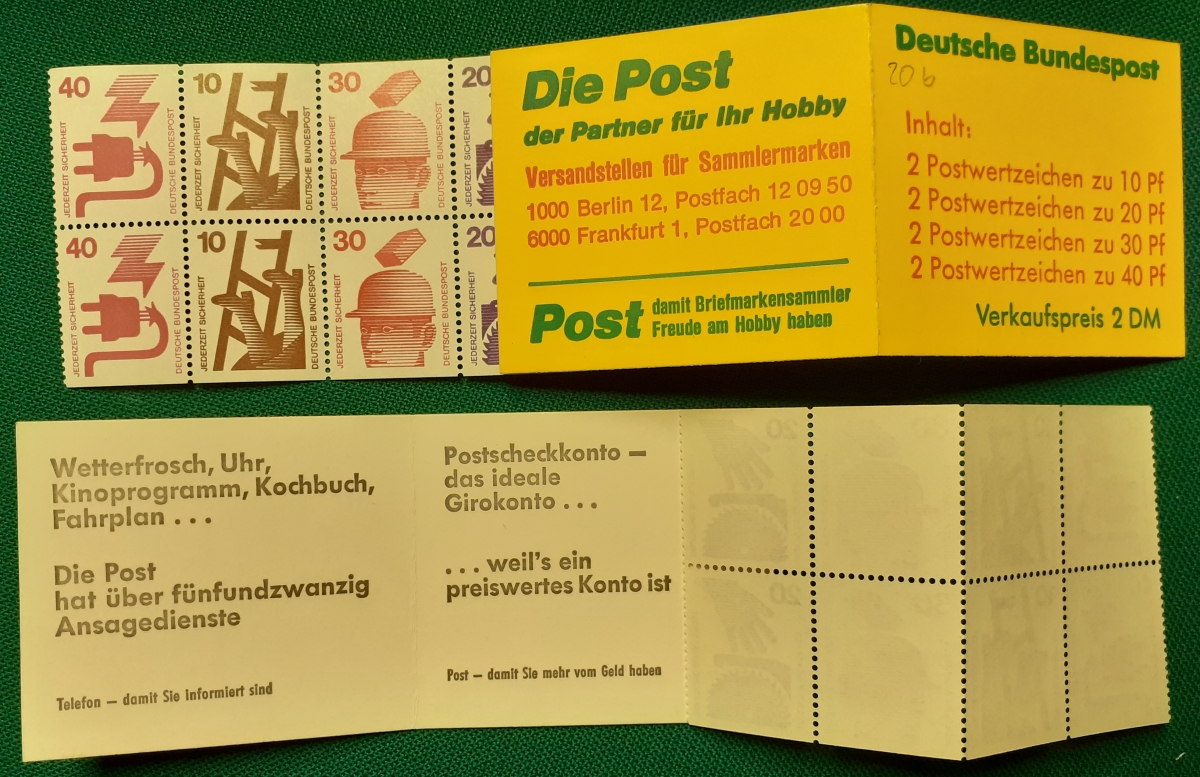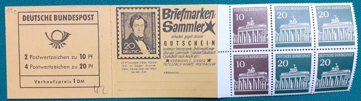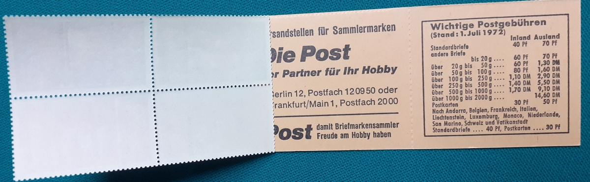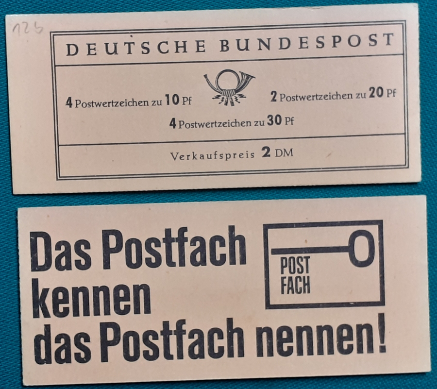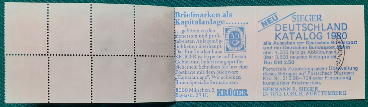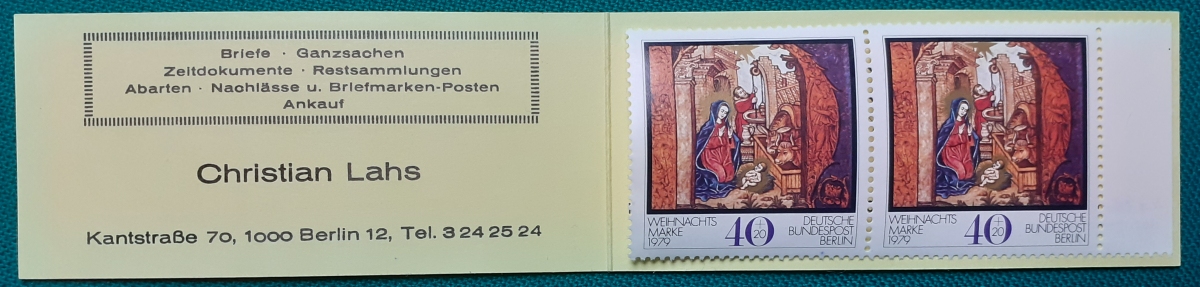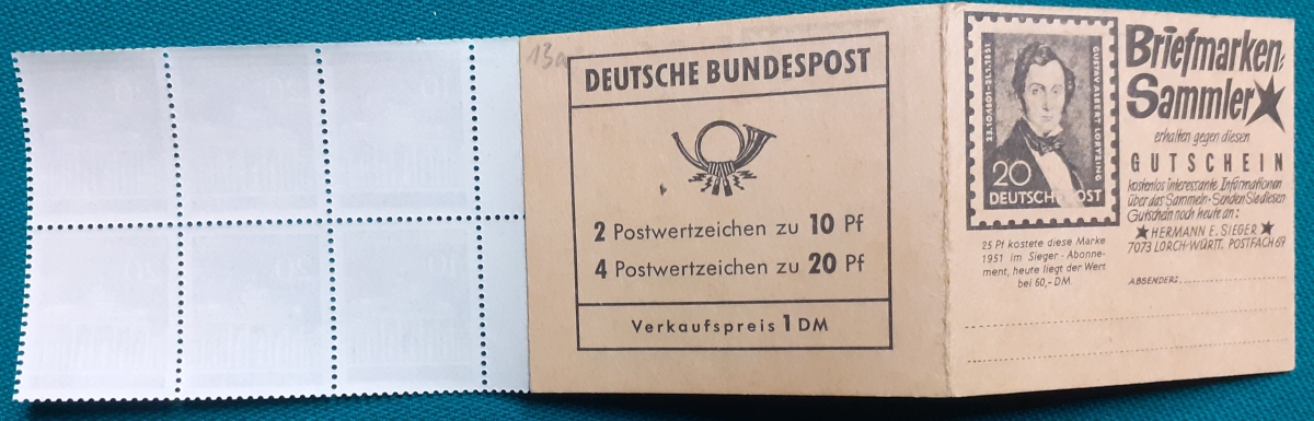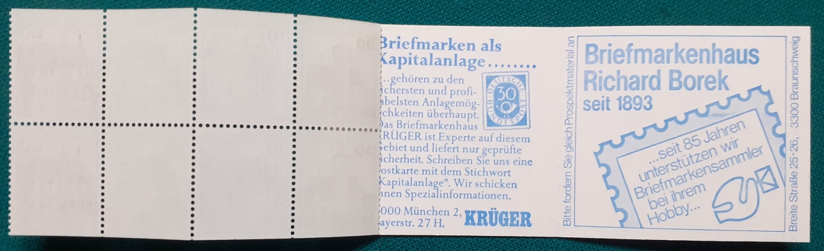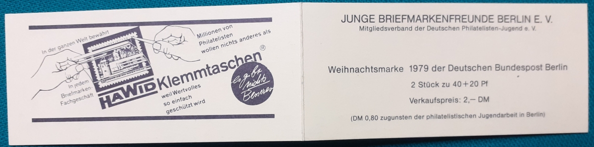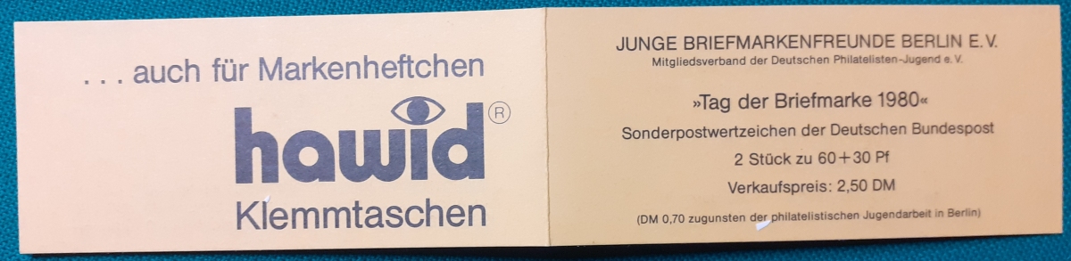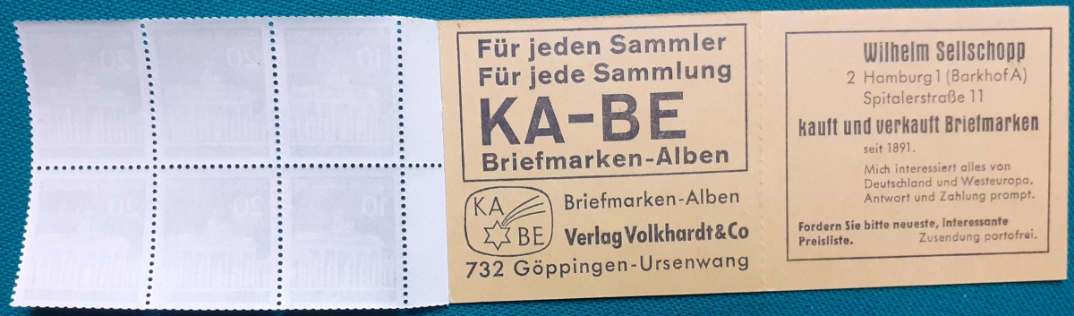 Privates Markenheftchen: Zwei Marken 40 + 20 Pf. postfrisch gummiert; Werbungen: Christian Lahs, Philatelie; HAWID-Klemmtaschen; sehr guter altersgemäßer Zustand Preis: 3 EURO |