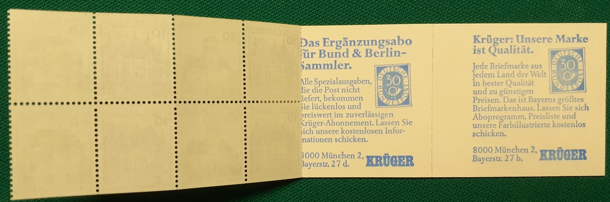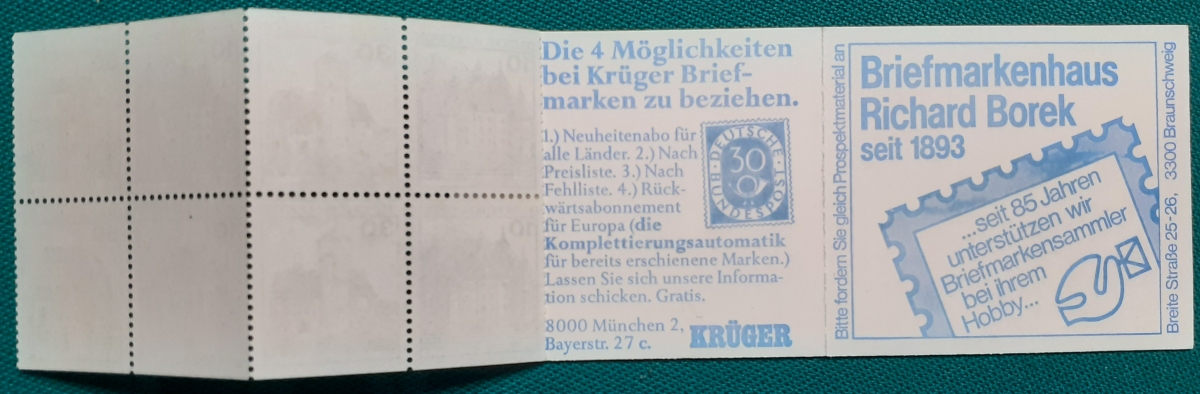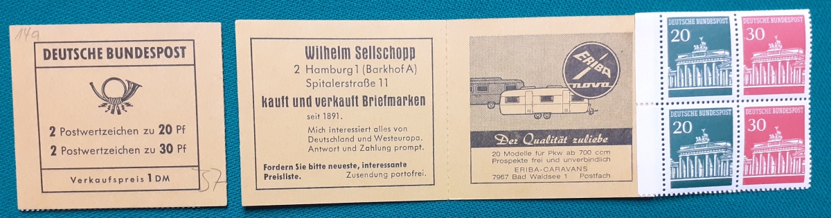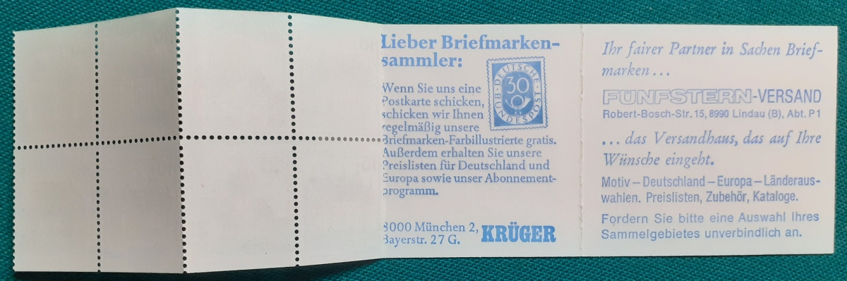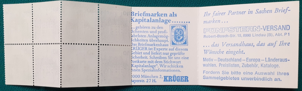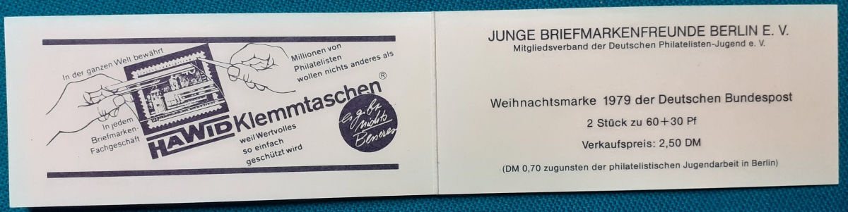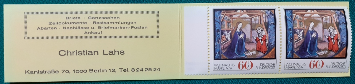 Privates Markenheftchen: Zwei Marken 60 + 30 Pf. postfrisch gummiert; Werbungen: Christian Lahs, Philatelie; HAWID-Klemmtaschen; sehr guter altersgemäßer Zustand Preis: 3 EURO |