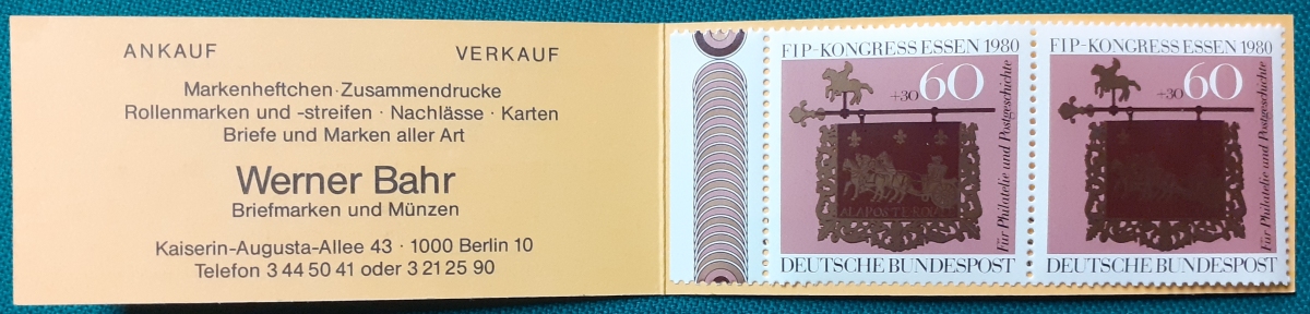 Privates Markenheftchen: Zwei Marken FIP Kongress Essen 1980 - 60 + 30 Pf. postfrisch gummiert; Werbungen: Werner Bahr, Philatelie; HAWID-Klemmtaschen; sehr guter altersgemäßer Zustand Preis: 3 EURO |