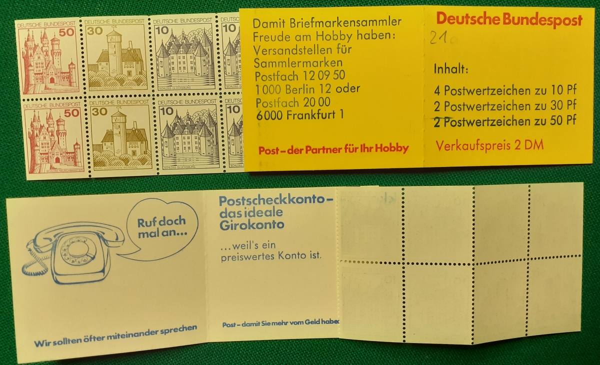 Markenheftchen Michel-Nr. MH21; (mit Heftchenblatt: Ruf doch mal an - Postscheckkonto); sehr guter altersgemäßer Zustand Preis: 5 EURO |