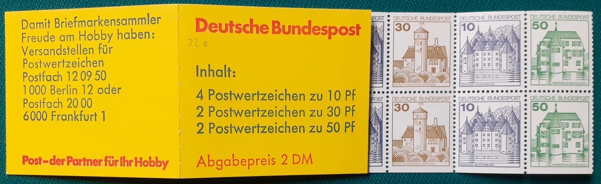 Markenheftchen Michel-Nr. MH22a; (mit Heftchenblatt: Fünfsternversand - Marken als Kapitalanlage); sehr guter altersgemäßer Zustand Preis: 5 EURO |