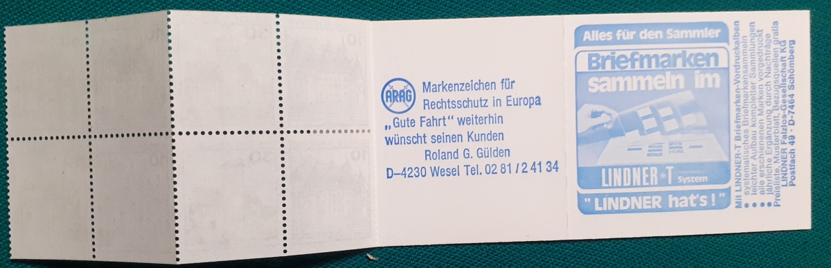 Markenheftchen Michel-Nr. MH22c; (mit Heftchenblatt: Lindner - ARAG); sehr guter altersgemäßer Zustand Preis: 5 EURO |