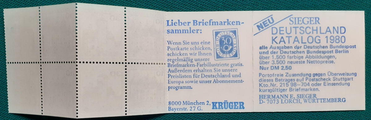 Markenheftchen Michel-Nr. MH22d; (mit Heftchenblatt: SIEGER - Krüger); sehr guter altersgemäßer Zustand Preis: 5 EURO |