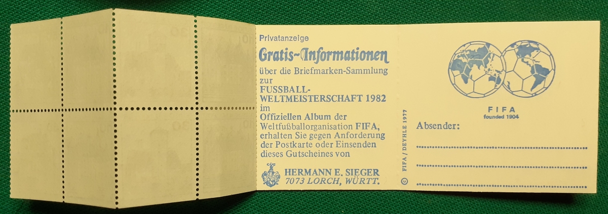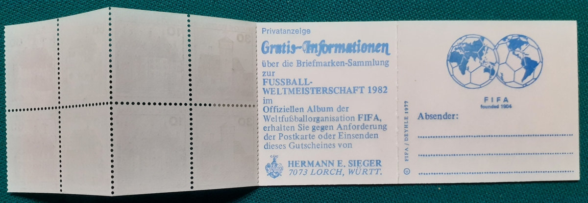 Markenheftchen Michel-Nr. MH23b; (mit Heftchenblatt: Fifa); sehr guter altersgemäßer Zustand Preis: 5 EURO |
