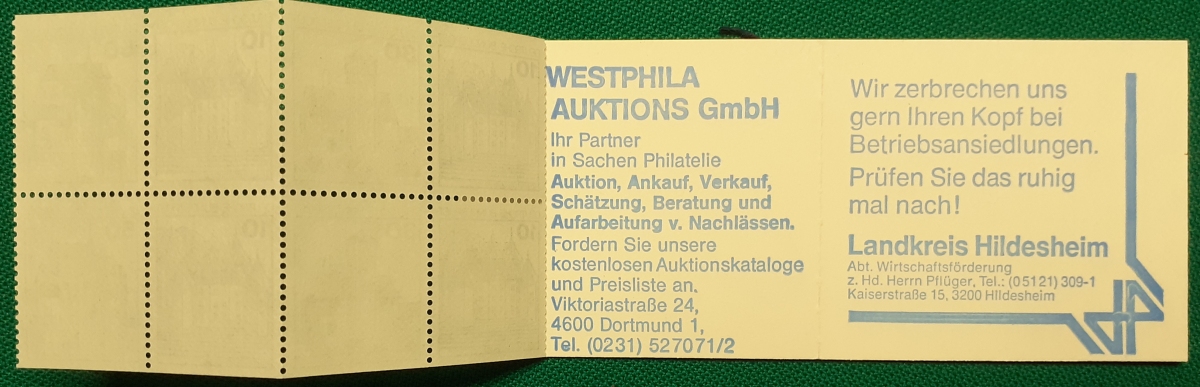 Markenheftchen Michel-Nr. MH22i; (mit Heftchenblatt: Landkreis Hildesheim); sehr guter altersgemäßer Zustand Preis: 5 EURO |