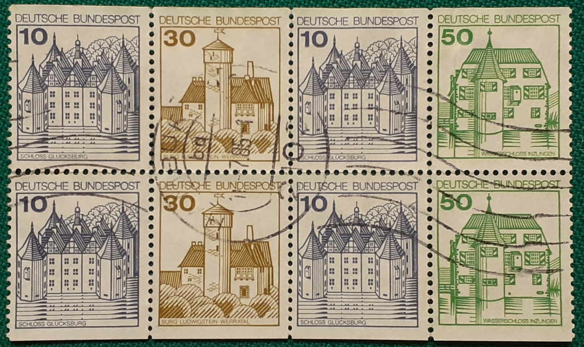 Heftchenblatt: Michel-Nr. aus Markenheftchen MH 22 Alle acht Marken des Markenheftchens MH 22 als Zusammendruck; gestempelt in Hamburg am 10.7.1985; etwas wellig vom Ablösen; recht guter altersgemäßer Zustand Preis: 2 EURO |
