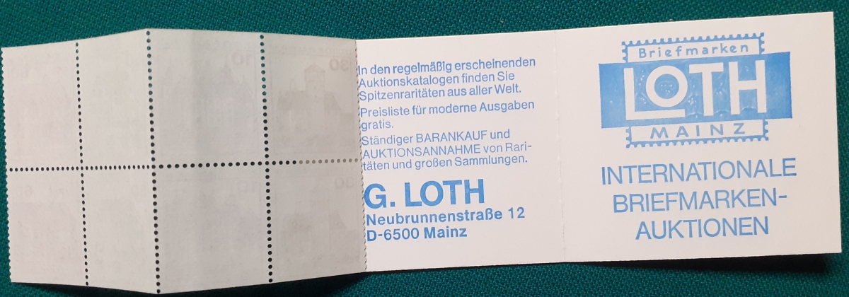 Markenheftchen Michel-Nr. MH23c; (mit Heftchenblatt: Loth Briefmarkenhandel in Mainz); sehr guter altersgemäßer Zustand Preis: 5 EURO |