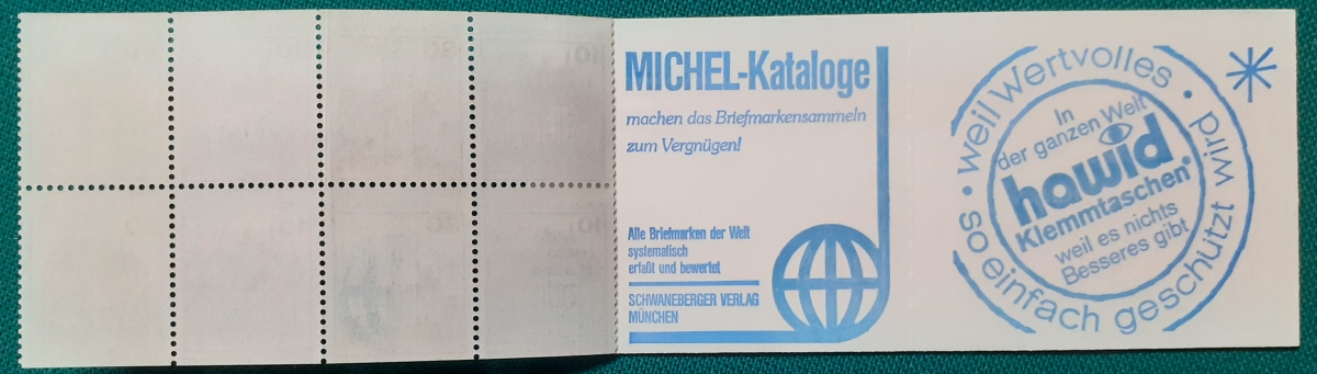 Markenheftchen Michel-Nr. MH11 (Rückseite ...Michel-Kataloge - Hawid-Klemmtaschen); postfrisch gummiert; sehr guter altersgemäßer Zustand Preis: 5 EURO |