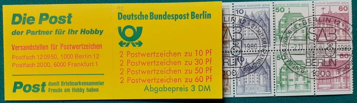 Markenheftchen Michel-Nr. MH12 (Rückseite ...Briefmarken als Kapitalanlage - Sieger-Deutschland-Katalog); mit sehr schönen Sonderstempeln der 9. Internationalen Sammlerbörse am 2.11.1980 in Berlin); sehr guter altersgemäßer Zustand Preis: 11 EURO |