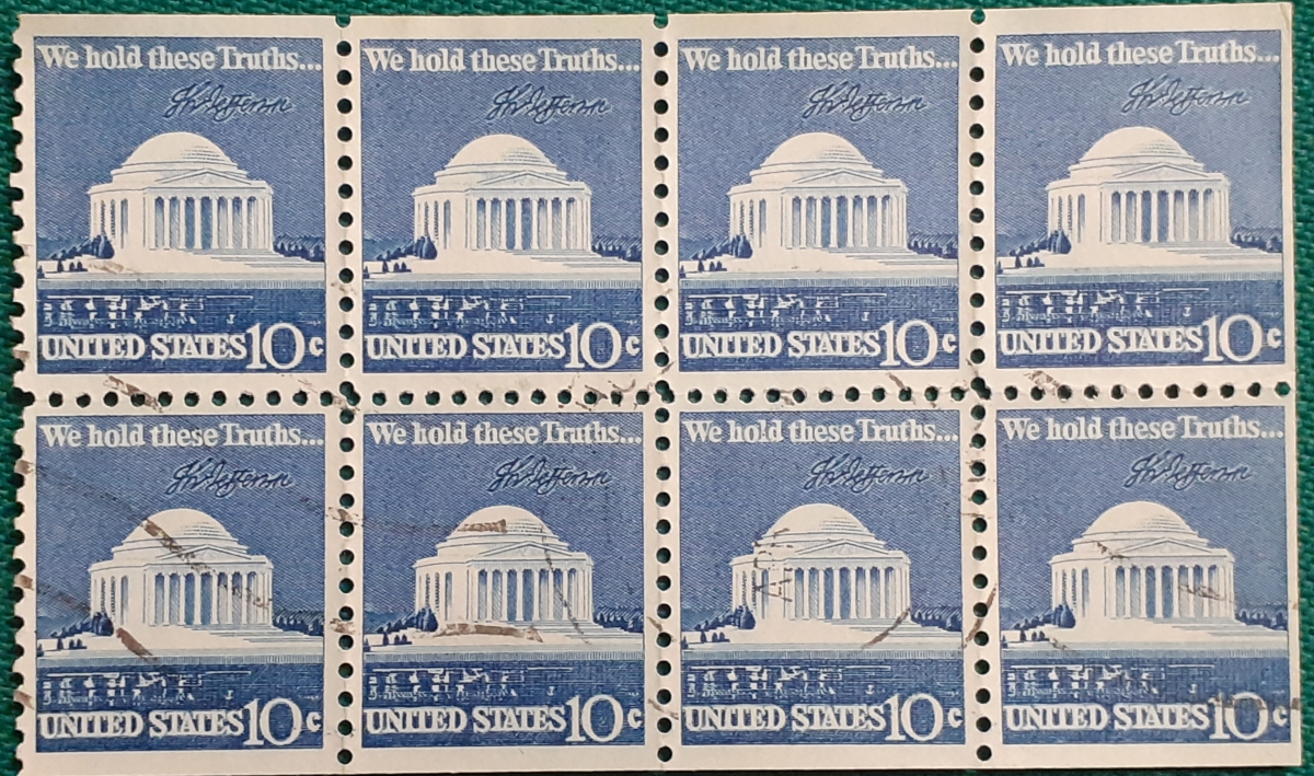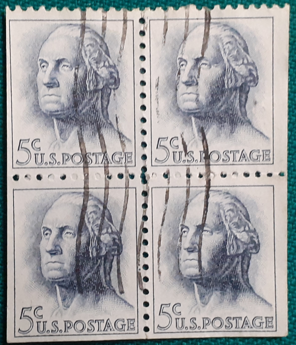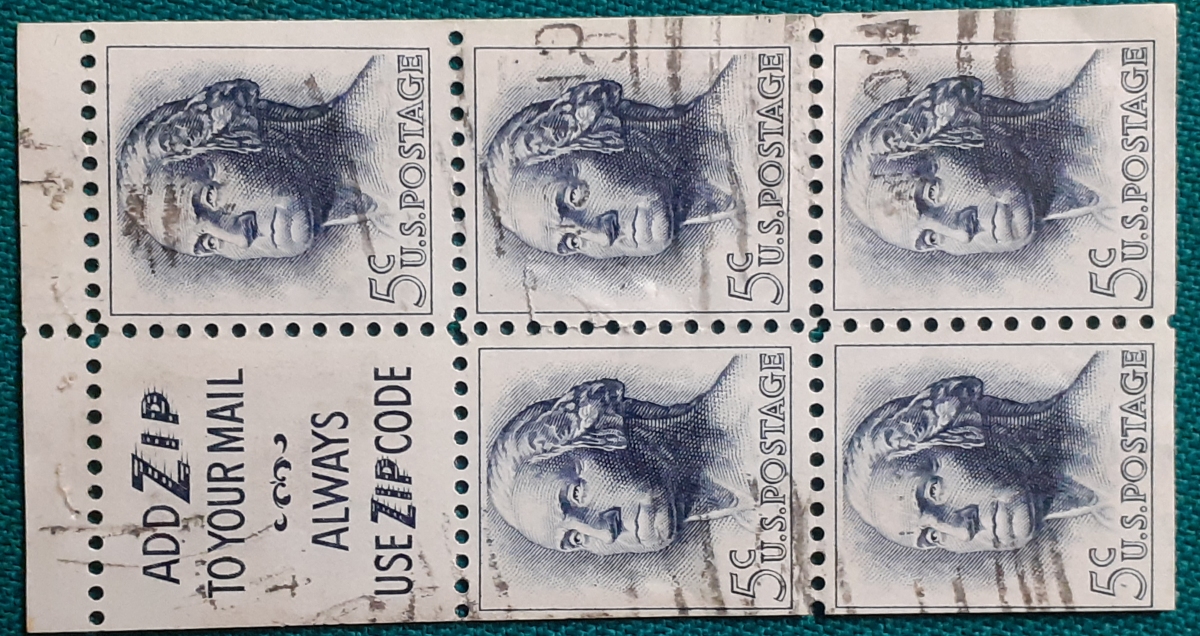 Heftchenblatt 33y; Papier mit Phosphoraufdruck bestehend aus 5 Marken George Washington 5 C und einem ZIP-Code-Anhänger; gestempelt; Klebereste am Rücken, z.T. leicht beschädigt; befriedigender altersgemäßer Zustand Preis: 3 EURO |