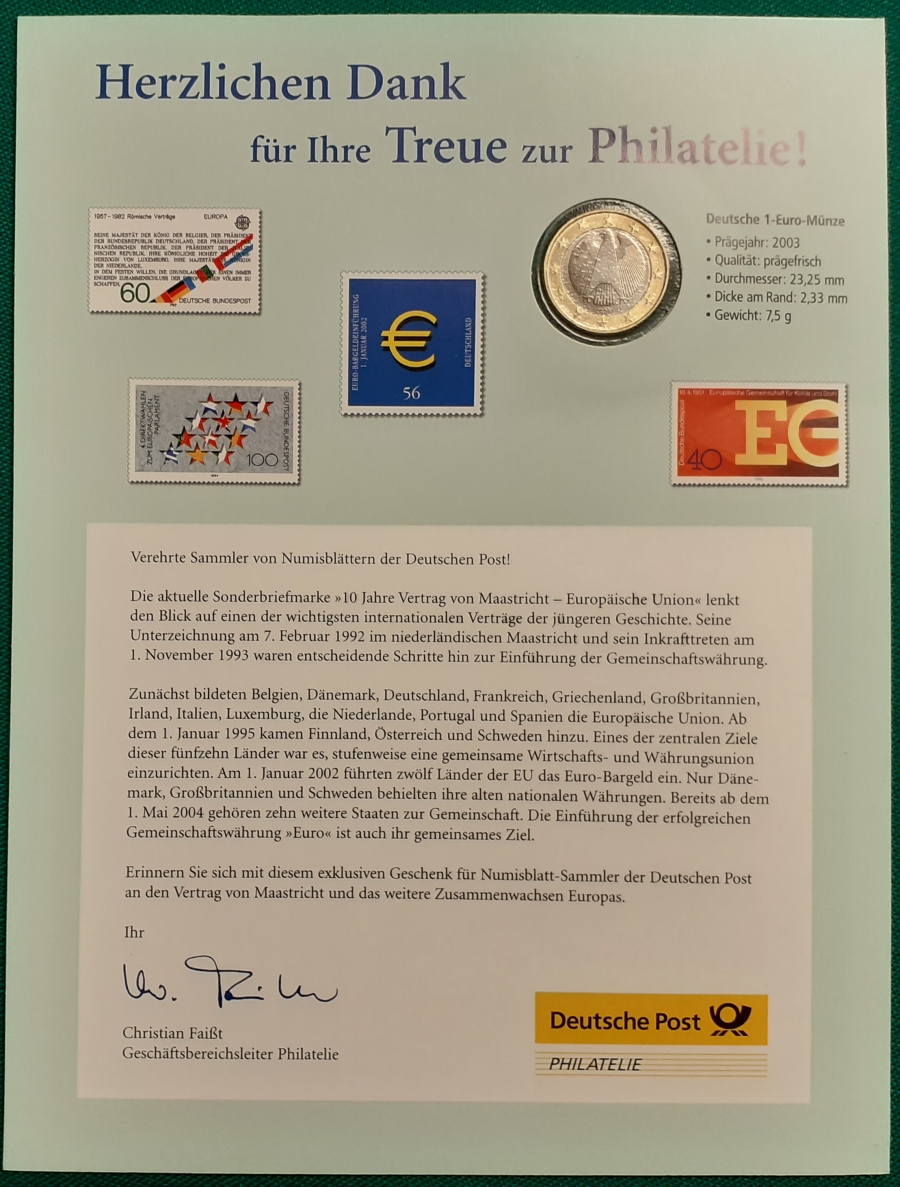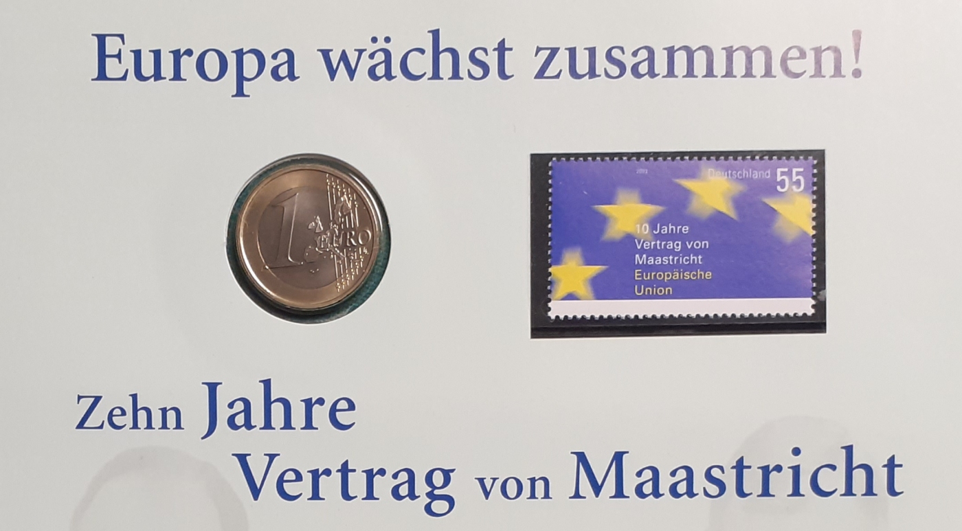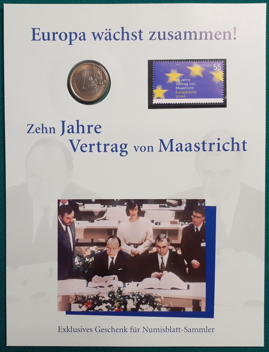 Europa wächst zusammen: Numisblatt der Deutschen Post im Format 21 x 16 cm; das Numisblatt beinhaltet die Briefmarke "10 Jahre Vertrag von Maastricht" in Klemmtasche, postfrisch gummiert; dazu die Deutsche 1 EURO-Kursmünze, prägefrisch von 2003, Münzzeichen A eingeschweißt; dazu geschichtliche Hinweise zur Entwicklung der EU; das Ganze in passender Hülle von Leuchtturm mit Lochrand; sehr guter - neuwertiger - Zustand Preis: 8 EURO |