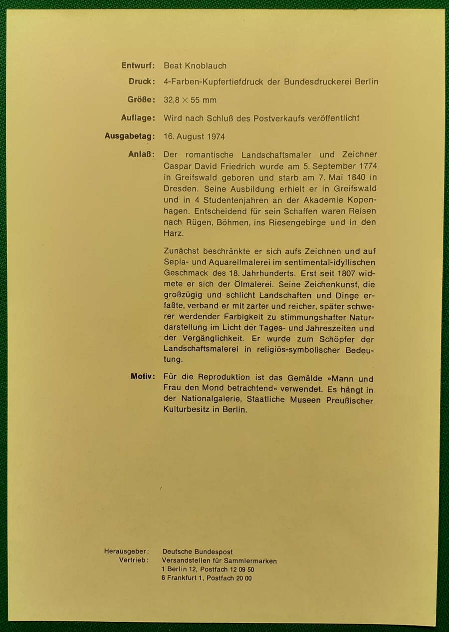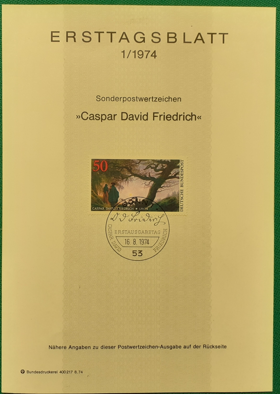 ETB 1/1974 Caspar David Friedrich Ausgabetag 16.8.1974; sehr guter - neuwertiger - Zustand Preis: 4 EURO |