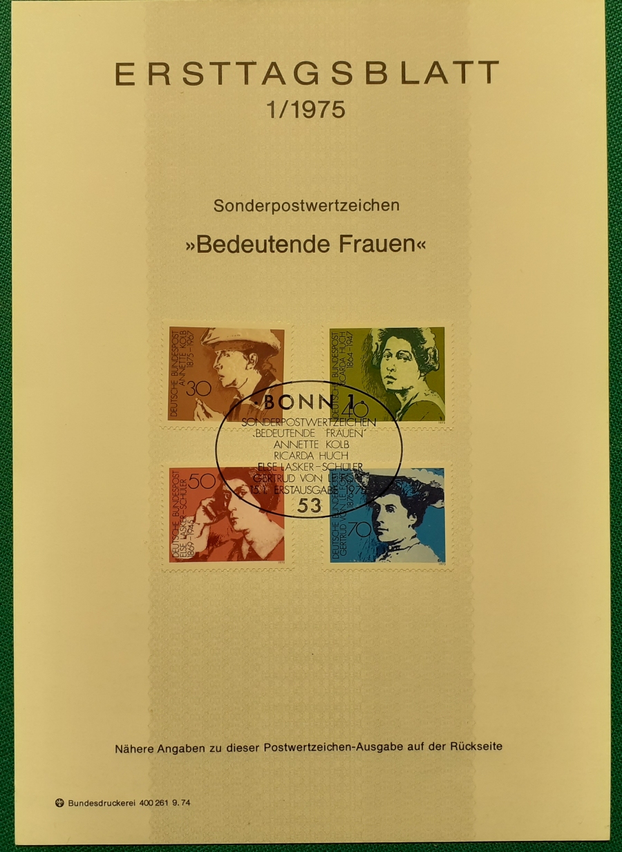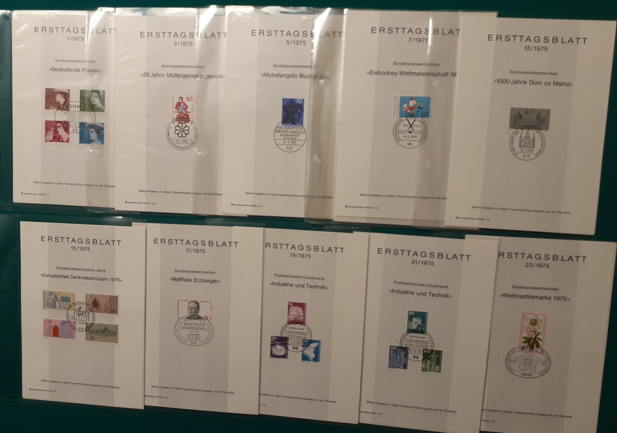 Jahrgang: 24 Blätter: Bedeutende Frauen - Albert Schweitzer - -25 Jahre Müttergenesungswerk - Hans Böckler - Michelangelo Buonarroti - Heiliges Jahr - Eishockey-Weltmeisterschaft 1975 - Jugendmarken 1975 - Europa-Marken 1975 - Eduard Mörike - 500-Jahrfeier der Belagerung von Neuss - 500 Jahre Landshuter Hochzeit - 1000 Jahre Dom zu Mainz - Industrie und Technik (3 Werte der Dauerserie) - Europäisches Denkmalschutzjahr 1975 - Drogenmißbrauch - Matthias Erzberger - Tag der Briefmarke 1975 - Industrie und Technik (3 Werte der Dauerserie) - Wohlfahrtsmarken 1975 - Industrie und Technik (3 Werte der Dauerserie) - Deutsche Friedensnobelpreisträger - Weihnachtsmarke 1975 - Industrie und Technik (3 Werte der Dauerserie) sehr guter - neuwertiger - Zustand Komplettpreis: 12 EURO / 24 Stück |