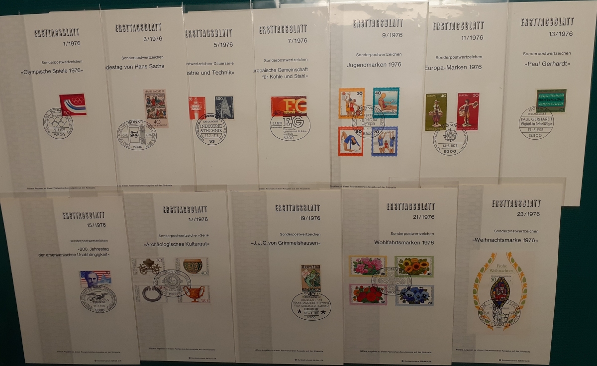 Jahrgang: 23 Blätter: Olympische Spiele 1976 - 100. Geburtstag von Dr. Konrad Adenauer - 400. Todestag von Hans Sachs - 50 Jahre Deutsche Lufthansa - Industrie und Technik (2 Werte der Dauerserie) - 25 Jahre Bundesverfassungsgericht - 25 Jahre Europäische Gemeinschaft für Kohle und Stahl - 75 Jahre Wuppertaler Schwebebahn - Jugendmarken 1976 - Olympiamarken 1976 - Europa-Marken 1976 - Carl Sonnenschein - Paul Gerhardt - Carl Maria von Weber - 200. Jahrestag der amerikanischen Unabhängigkeit - 100 Jahre Bayreuther Festspiele - Archäologisches Kulturgut - Vogelschutz - J. J. C. von Grimmelshausen - Tag der Briefmarke 1976 - Wohlfahrtsmarken 1976 - Bedeutende Frauen - Weihnachtsmarke 1976 sehr guter - neuwertiger - Zustand Komplettpreis: 12 EURO / 23 Stück |