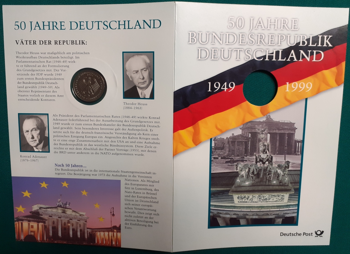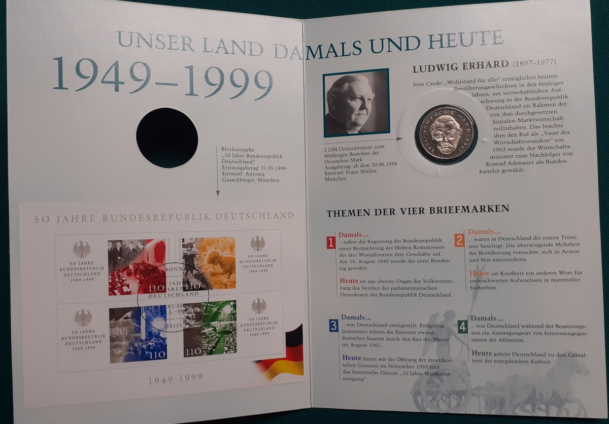 50 Jahre Bundesrepublik Deutschland 1949 - 1999 Numisblatt der Deutschen Post mit vier Seiten im Format 21 x 14 cm; das Numisblatt beinhaltet die Blockausgabe "50 Jahre BRD" mit dem Ersttagsstempel vom 21.5.1999; dazu die 2 DM Münze Ludwig Erhard von 1994, Münzzeichen D in polierter Platte eingeschweißt; dazu geschichtliche Hinweise zu der Münze und den Motiven des Briefmarkenblocks; sehr guter - neuwertiger - Zustand Preis: 11 EURO |
