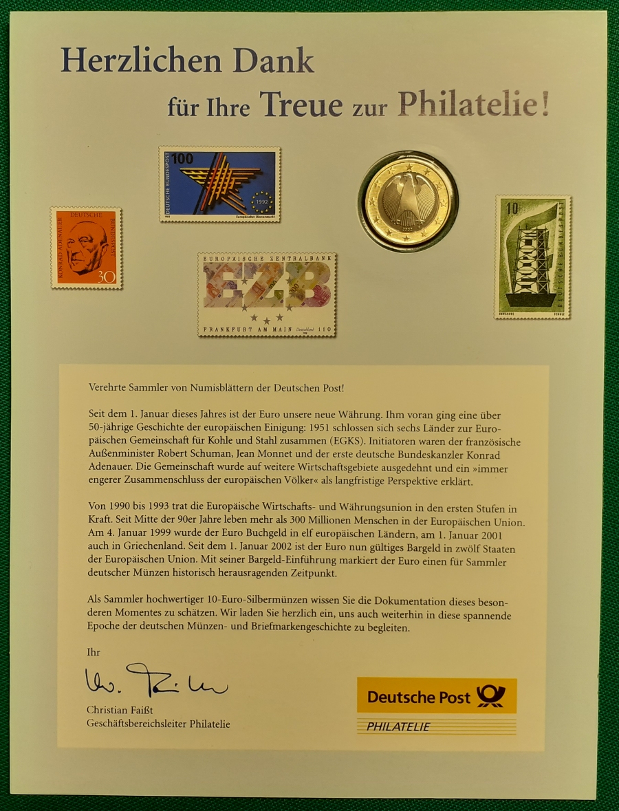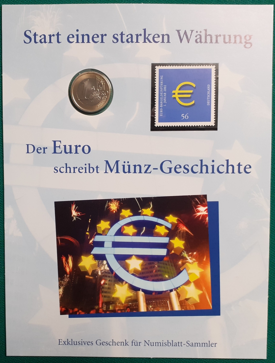 Start einer starken Währung: Numisblatt der Deutschen Post im Format 21 x 16 cm; das Numisblatt beinhaltet die Briefmarke "EURO Einführung vom 1.1.2002" in Klemmtasche, postfrisch gummiert; dazu die Deutsche 1 EURO-Kursmünze, prägefrisch von 2002, Münzzeichen D eingeschweißt; dazu geschichtliche Hinweise zur Entwicklung der EU; das Ganze in passender Hülle von Leuchtturm mit Lochrand; sehr guter - neuwertiger - Zustand Preis: 8 EURO |