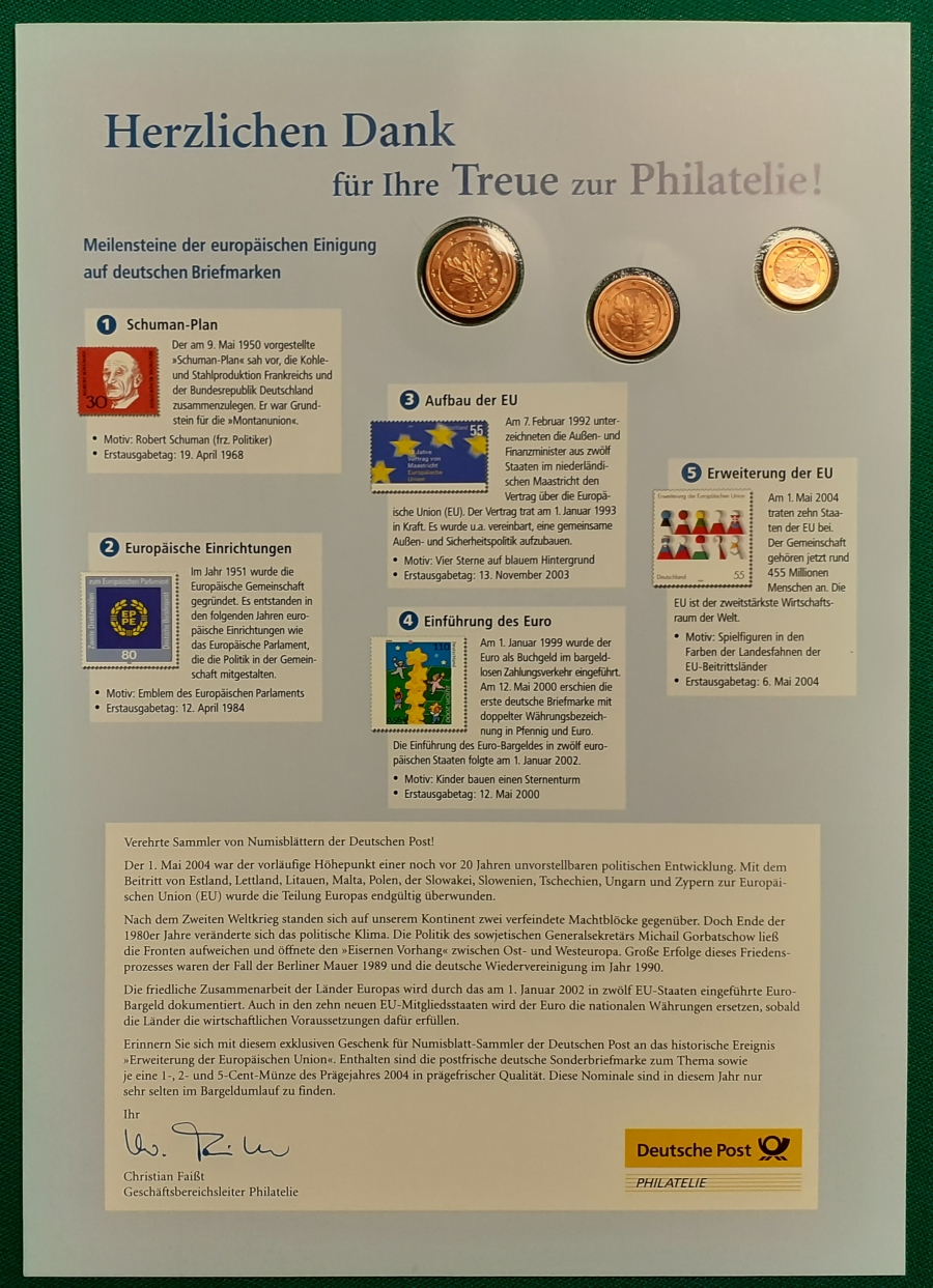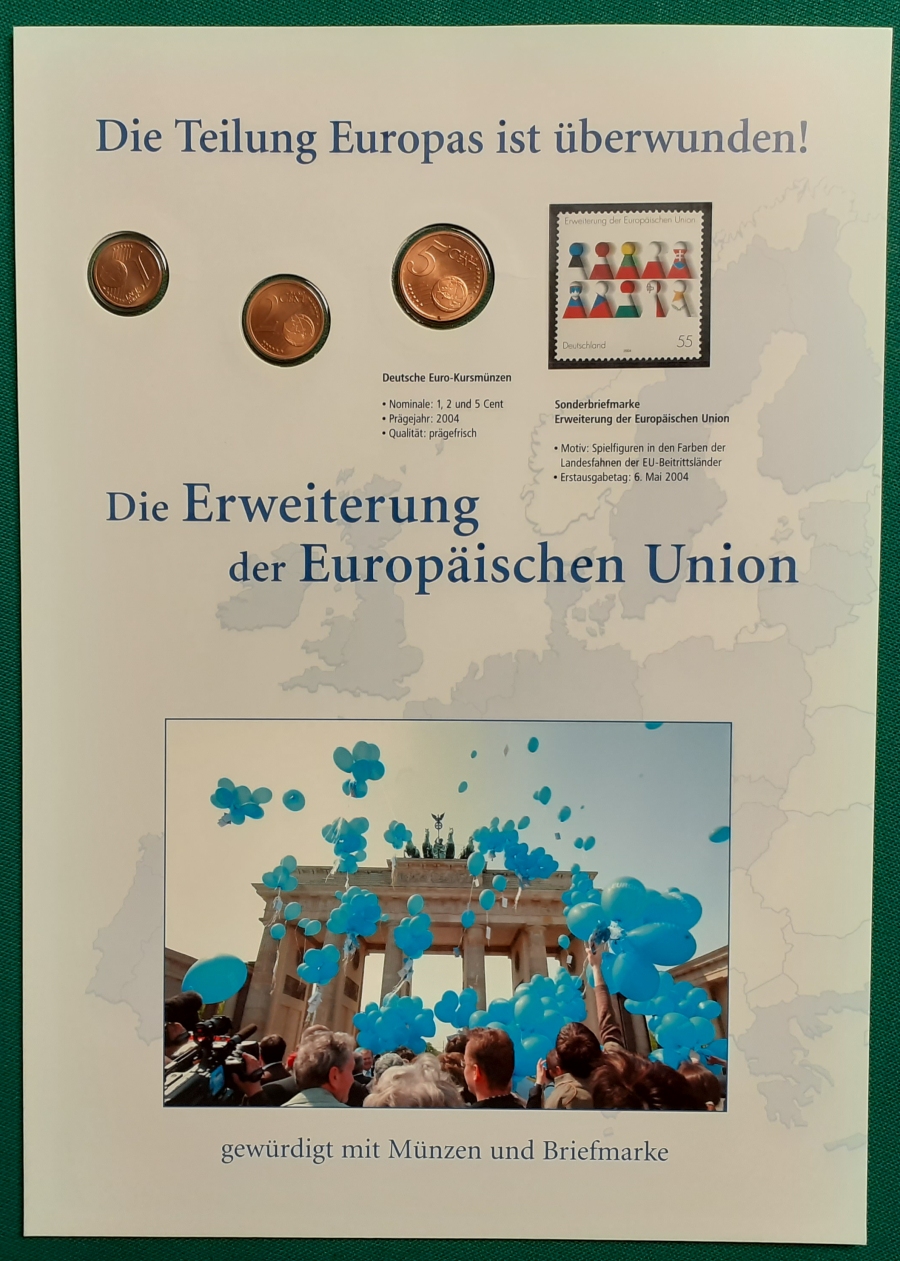 Die Erweiterung der EU 2004 Numisblatt der Deutschen Post mit vier Seiten im Format 29,5 x 21 cm; das Numisblatt beinhaltet die Briefmarke "Erweiterung der EU 2004" in Klemmtasche, postfrisch gummiert; dazu die drei Deutschen EURO-Kursmünzen: 1,2 und 5 Cent von 2004, prägefrisch, Münzzeichen A eingeschweißt; dazu geschichtliche Hinweise zur Entwicklung der EU; sehr guter - neuwertiger - Zustand Preis: 11 EURO |