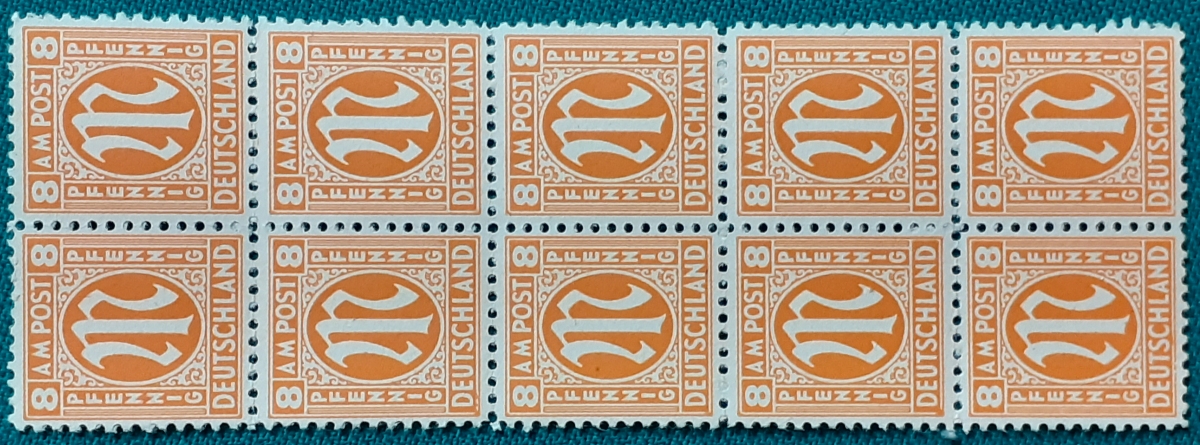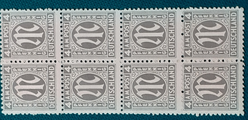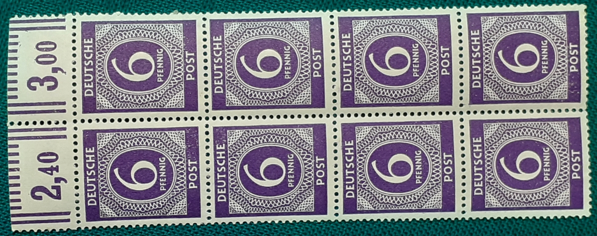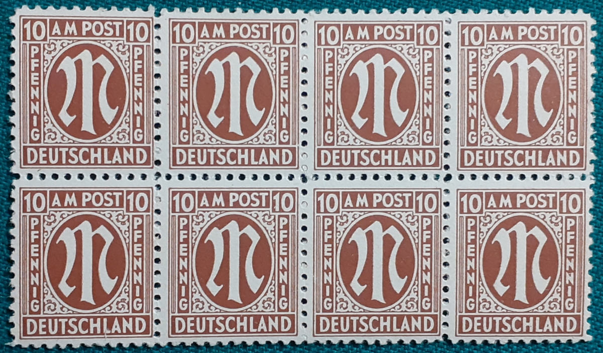 Bezeichnung: Ausgabewert: 10 Rpf Buchstabe M Ausgabetag der Marke: 20.06.1945 Michel-Nr. 6 Zusammendruck; Bogenabschnitt von 8 Stück; postfrisch gummiert; sehr guter altersgemäßer Zustand Preis: 4 EURO |
