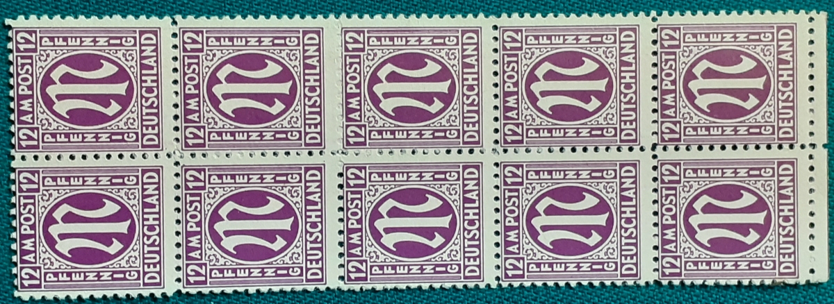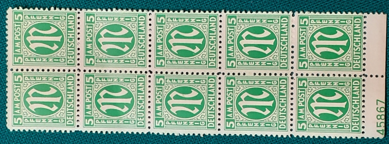 Buchstabe M Ausgabetag der Marke: 20.06.1945 Michel-Nr. 5 Zusammendruck; Bogenabschnitt von 10 Stück; postfrisch gummiert; sehr guter altersgemäßer Zustand Preis: 4 EURO |