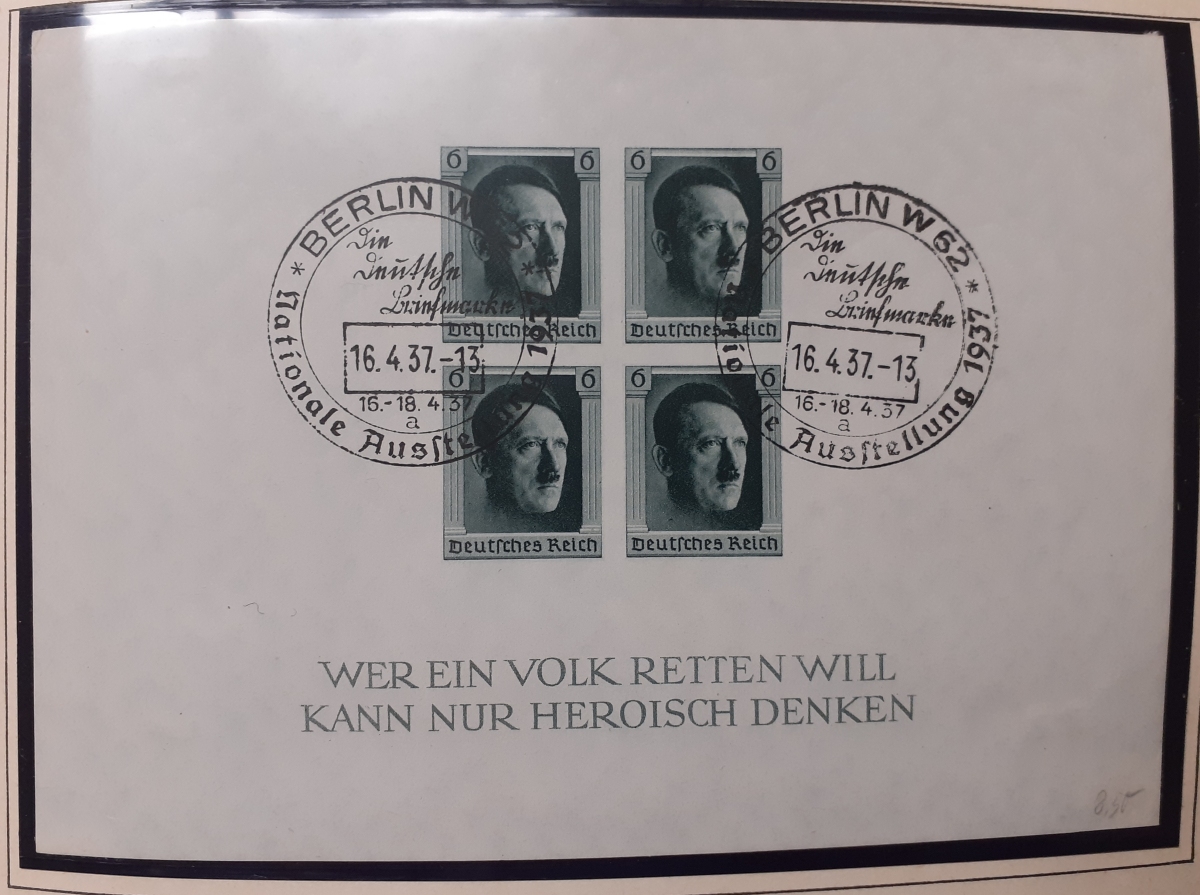 Block mit Ersttagsstempel Michel-Block-Nr. 8 148 x 105 mm; mit Ersttagsstempel vom 16.4.1937 von der Nationalen Briefmarken-Ausstellung vom 16. - 18.4.1937 in Berlin; sehr guter altersgemäßer Zustand Preis: 59 EURO Anmerkung Heinsohn: Es handelt sich um nationalsozialistische Propaganda; die Darstellung hier hat rein dokumentarischen Charakter und wird nur zu historisch-wissenschaftlichen Forschungszwecken abgegeben (gegen entsprechenden Nachweis) |