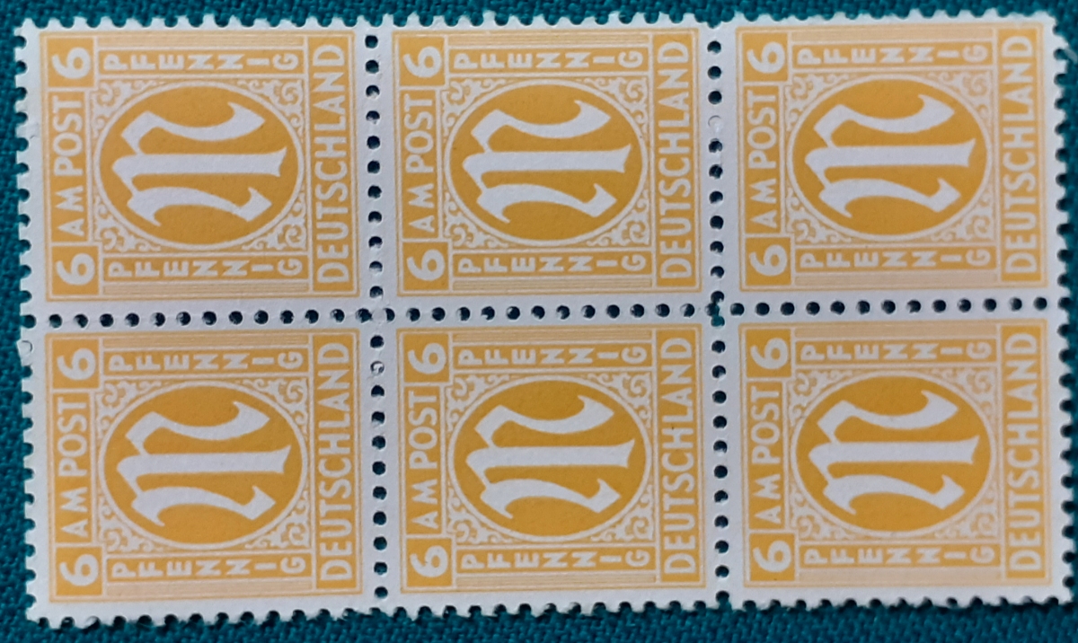 Buchstabe M Ausgabetag der Marke: 14.9.1945 Michel-Nr. 11 Zusammendruck; Bogenabschnitt von 6 Stück; postfrisch gummiert; sehr guter altersgemäßer Zustand Preis: 4 EURO |