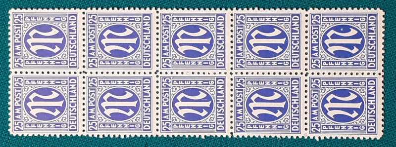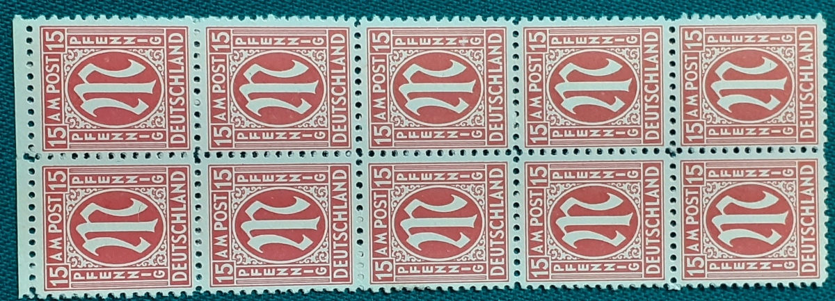 Buchstabe M Ausgabetag der Marke: 20.06.1945 Michel-Nr. 26 Zusammendruck; Bogenabschnitt von 10 Stück; postfrisch gummiert; sehr guter altersgemäßer Zustand Preis: 4 EURO |