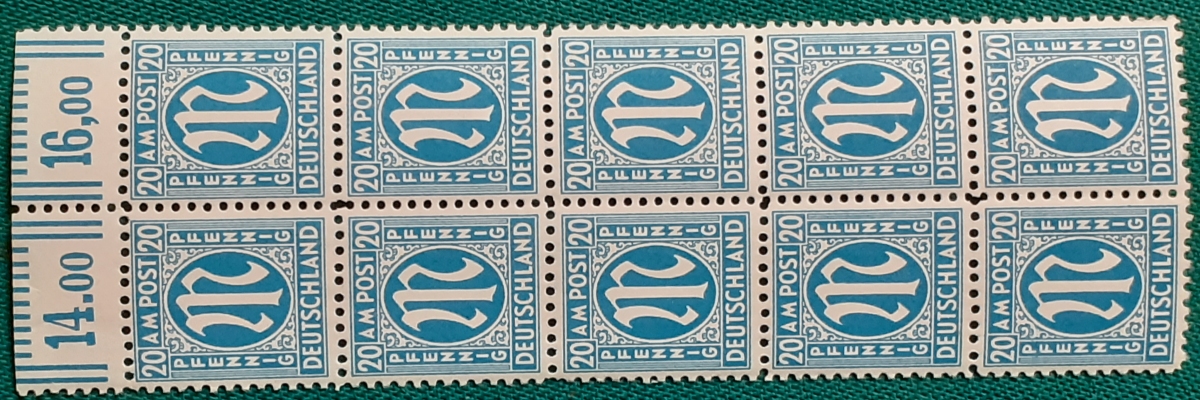 Buchstabe M Ausgabetag der Marke: 20.06.1945 Michel-Nr. 3 Zusammendruck; Bogenabschnitt von 10 Stück mit Randabschnitt; postfrisch gummiert; sehr guter altersgemäßer Zustand Preis: 4 EURO |