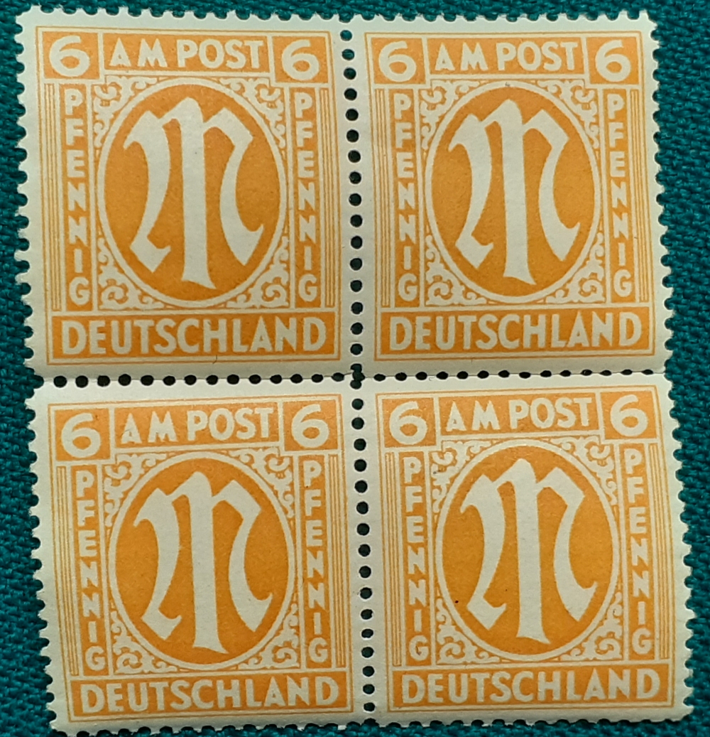 Buchstabe M Ausgabetag der Marke: 28.8.1945 Michel-Nr. 13 Zusammendruck; Bogenabschnitt von 4 Stück; postfrisch gummiert; sehr guter altersgemäßer Zustand Preis: 4 EURO |