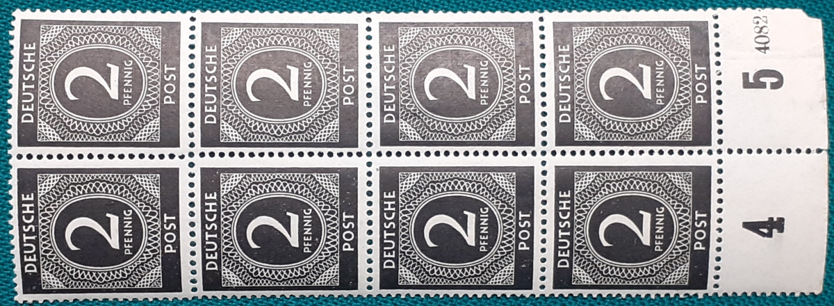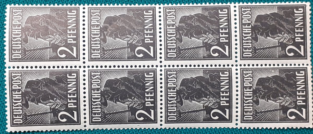 Buchstabe M Ausgabetag der Marke: 20.06.1945 Michel-Nr. 2 Zusammendruck; Bogenabschnitt von 8 Stück; postfrisch gummiert; sehr guter altersgemäßer Zustand Preis: 4 EURO |