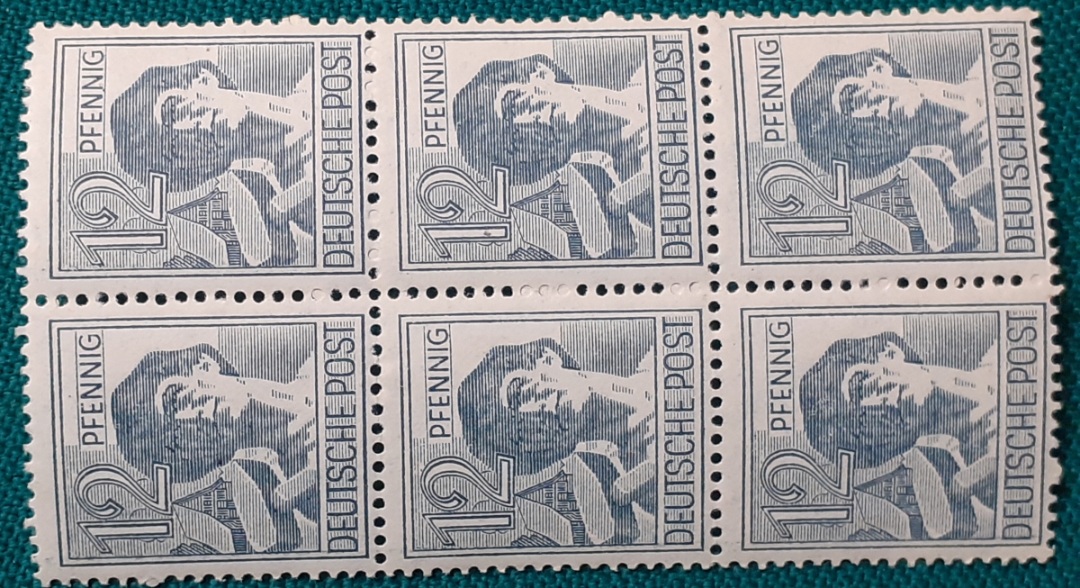 Bezeichnung: Ausgabewert: 12 Pf Text auf der Briefmarke: Pfennig, Deutsche Post Ausgabetag der Marke: 1.3.1947 Michel-Nr. 947 Zusammendruck; Bogenabschnitt von 6 Stück; postfrisch gummiert; sehr guter altersgemäßer Zustand Preis: 4 EURO |