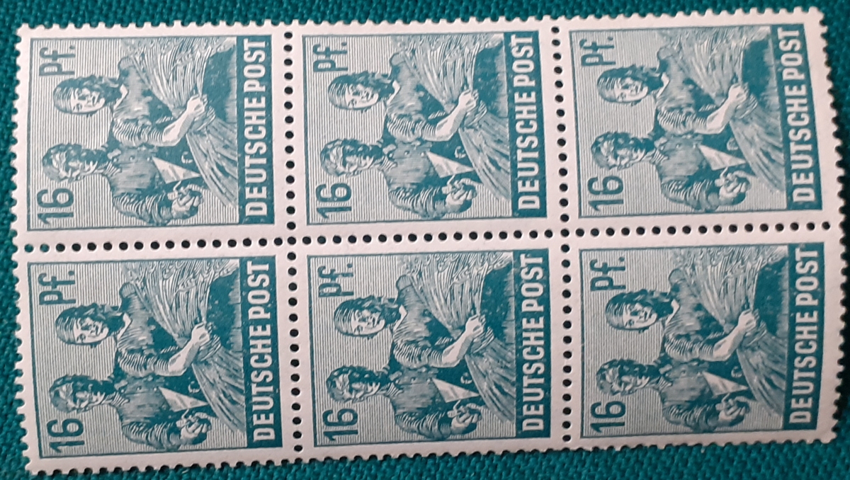 Bezeichnung: Ausgabewert: 16 Pf Text auf der Briefmarke: Pfennig, Deutsche Post Ausgabetag der Marke: 1.3.1947 Michel-Nr. 949 Zusammendruck; Bogenabschnitt von 6 Stück; postfrisch gummiert; sehr guter altersgemäßer Zustand Preis: 4 EURO |