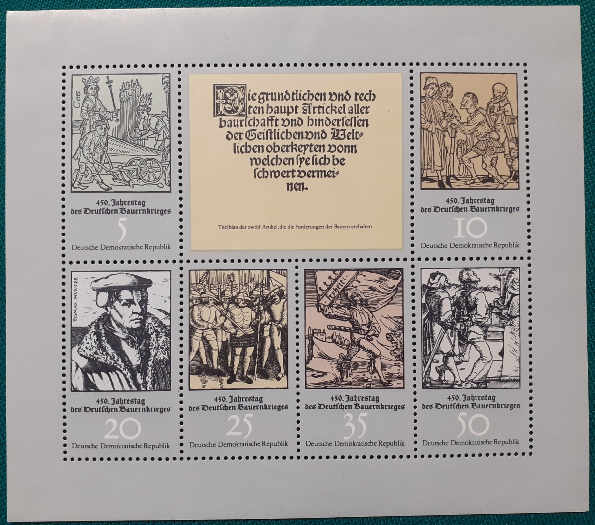 450. Jahrestag des Deutschen Bauernkrieges Michel-Nr. 2013 bis 2018 postfrisch gummiert; 13 x 11 cm; sehr guter altersgemäßer Zustand Preis: 4 EURO |