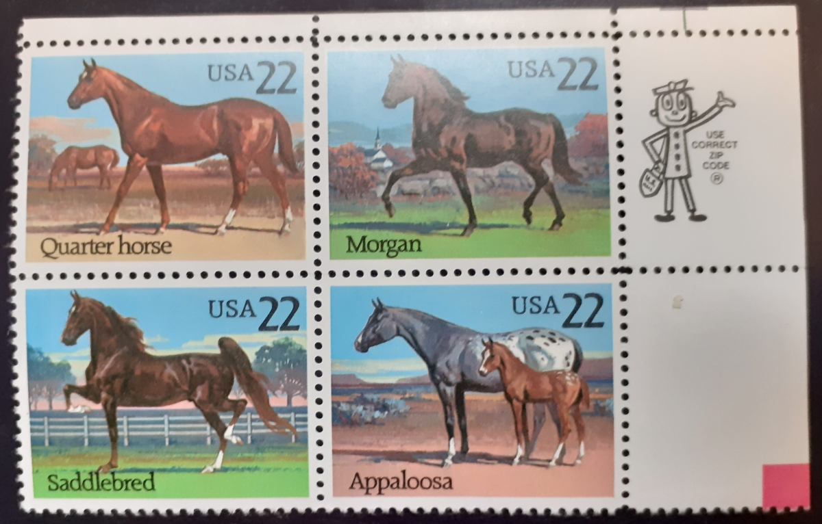 Pferderassen postfrisch gummiert; vier Marken zu 22 US-Cent; die Pferderassen Quarter Horse, Morgan, Saddlebred und Appaloosa finden sich auf den vier Briefmarken dieser Ausgabe aus den USA. Die Briefmarken erschienen am 25. September 1985; mit Mr. ZIP am Bogenrand; sehr guter altersgemäßer Zustand Preis: 5 EURO |