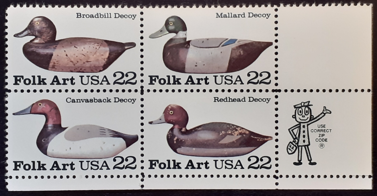 Folk Art: Entenrassen postfrisch gummiert; vier Marken zu 22 US-Cent; die Entenrassen Broadbill Decoy, Mallard Decoy, Canvasback Decoy und Redhead Decoy finden sich auf den vier Briefmarken dieser Ausgabe aus den USA. Die Briefmarken erschienen 1985; mit Mr. ZIP am Bogenrand; sehr guter altersgemäßer Zustand Preis: 5 EURO |