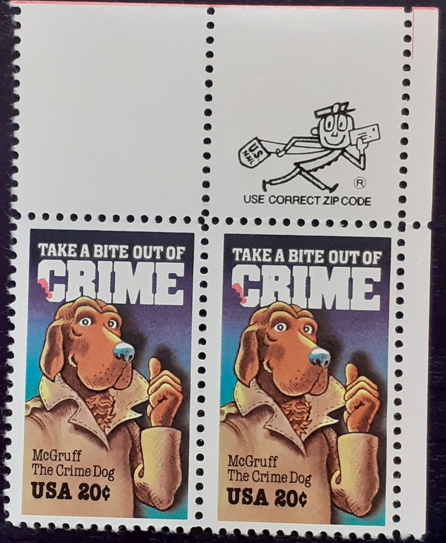 Take a Bite out of Crime: postfrisch gummiert; zwei Marken zu 20 US-Cent; Die Briefmarke erschien am 26. September 1984; mit Mr. ZIP am Bogenrand; sehr guter altersgemäßer Zustand Preis: 3 EURO |