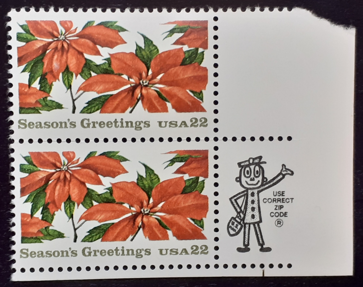 Season´s Greetings postfrisch gummiert; zwei Marken zu 22 US-Cent; Blumenmotiv: Weihnachtsstern; die Briefmarke erschienen 1985; mit Mr. ZIP am Bogenrand; sehr guter altersgemäßer Zustand Preis: 3 EURO |