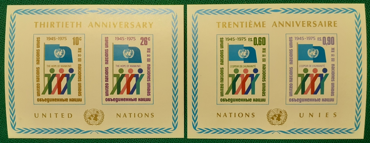 Zwei Blocks postfrisch gummierte Blocks in zwei Sprachen: Englisch und Französisch, Format ; je eine Ausgabe des Hauptsitzes in New York City und des Europäischen Amtes in Genf (Schweiz); je ca. 9 x 7 cm; sehr guter Zustand Komplettpreis: 8 EURO |
