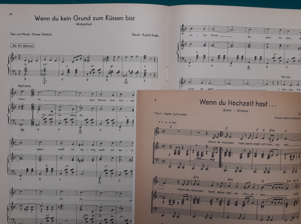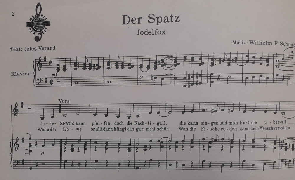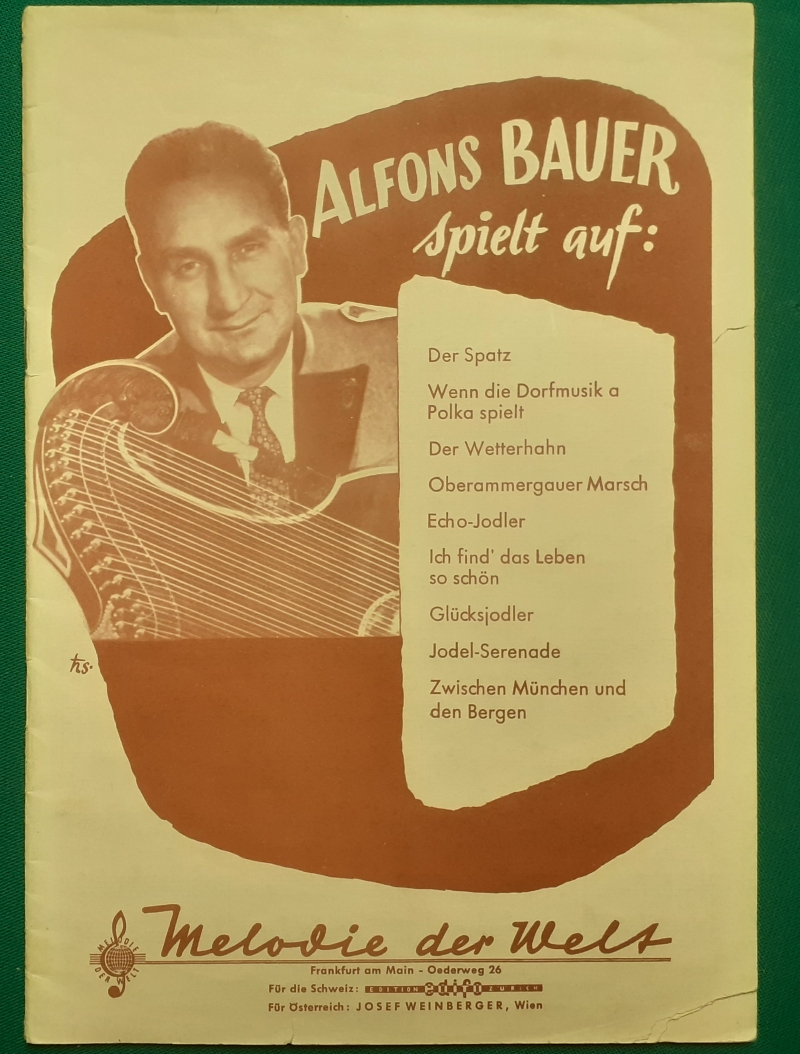 Alfons Bauer spielt auf Der Spatz - Wilhelm F. Schmid, Wenn die Dorfmusik a Polka spielt - H. Frei, Der Wetterhahn - Heinrich Frei; Oberammergauer Marsch - Hans Lothar Grahl, Echo-Jodler - Fritz Kraus; Ich find´das Leben so schön - Wilhelm F. Schmid; Glücksjodler - Biber; Jodel - Serenade - Heinrich Frei - Zwischen München und den Bergen - Fritz Kraus Klavierversionen mit Gesang und unterlegten Texten edifo, Frankfurt/M., Ausgabe von 1960, Heft mit 20 Seiten, recht guter Zustand, Preis: 4 EURO |