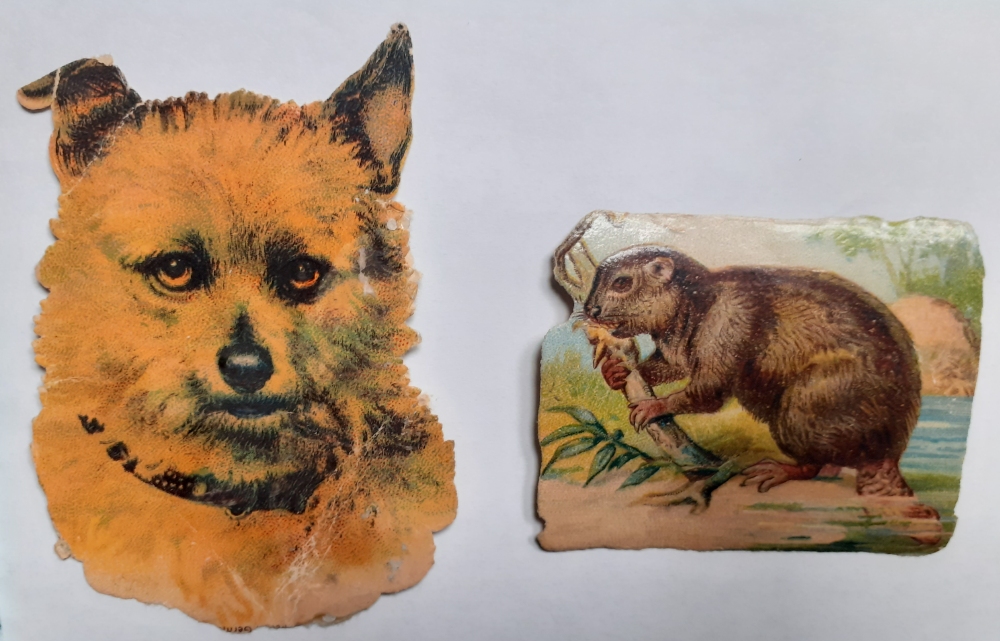 Hund ca. 8 x 6 cm Beschädigungen: Hund mit kleineren Knicken; Biber in sehr gutem Zustand |