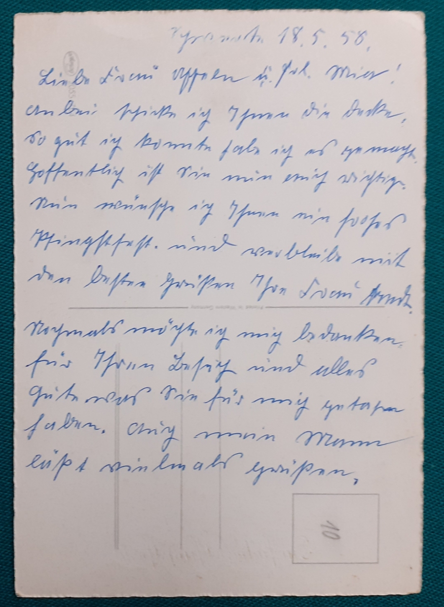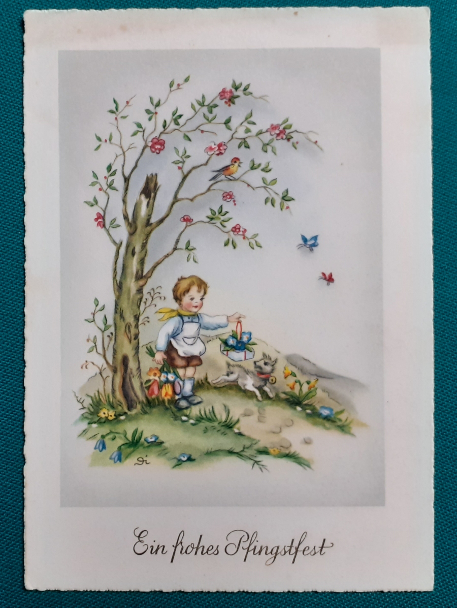 mit den Illustrationen von "Ein frohes Pfingstfest" Rückseite sauber am 18.5.1958 in Sütterlinschrift beschrieben; ungelaufen; oberer Rand etwas nachgedunkelt; farblich noch sehr schön und guter altersgemäßer Zustand Preis: 2 EURO |