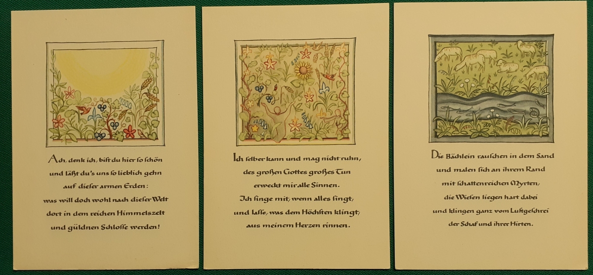 mit den Illustrationen von Es handelt sich um Karten der Liedkartenserie II des Verlages "Geh aus mein Herz und suche Freud" neu und ungelaufen; minimal an den Kanten bestoßen; sehr guter altersgemäßer Zustand Komplettpreis der 3 Karten: 4 EURO |