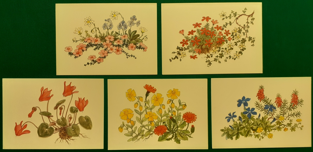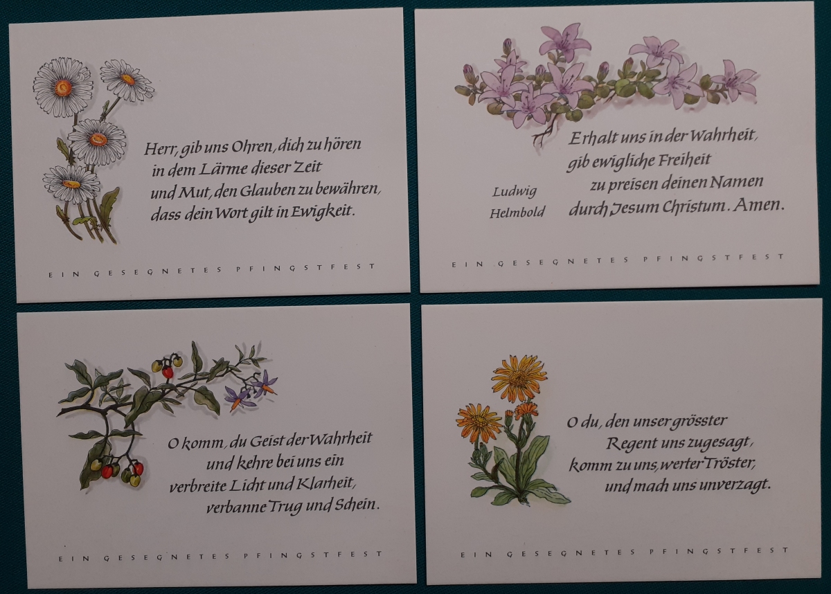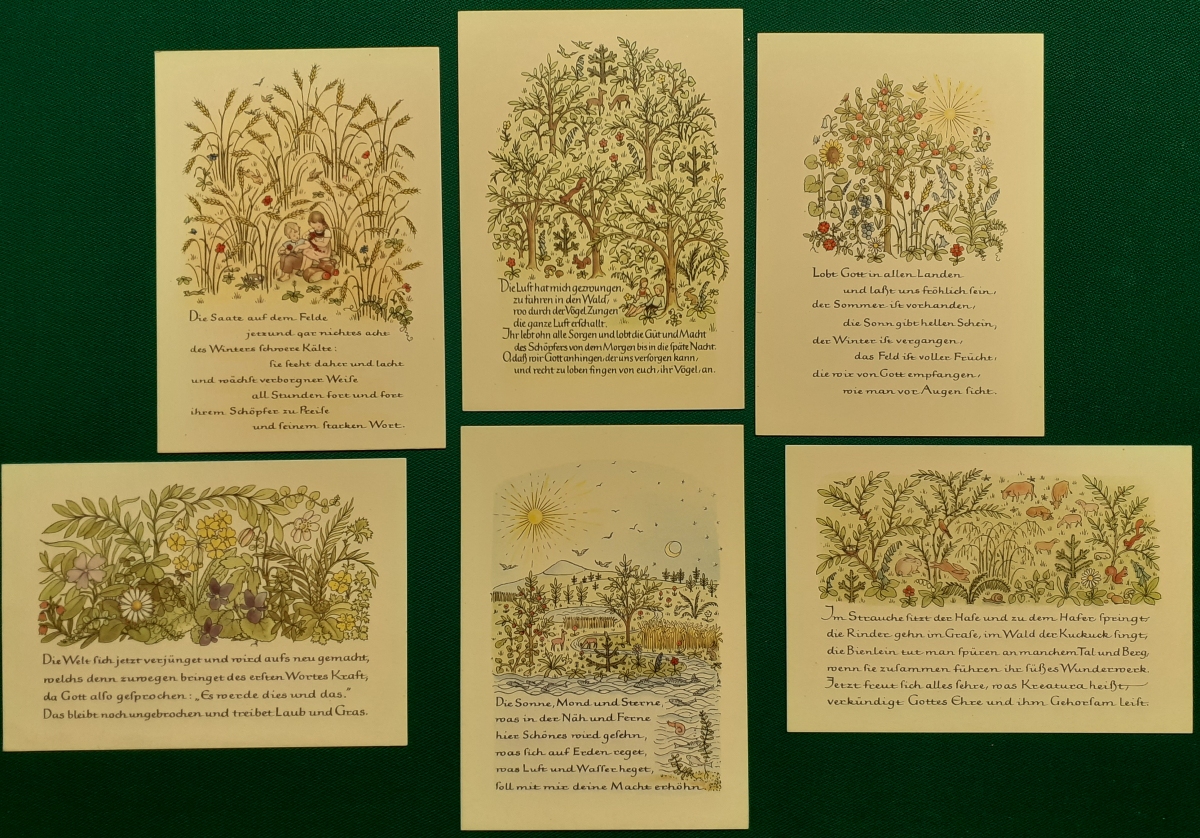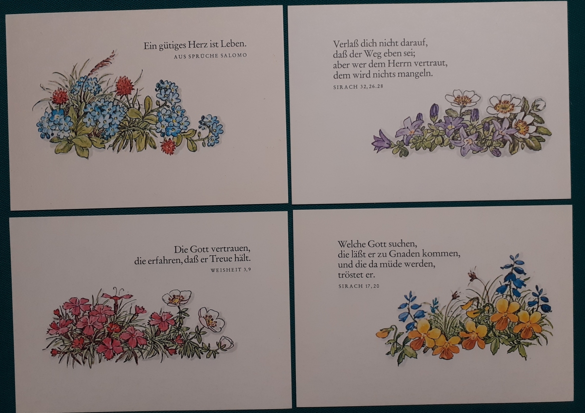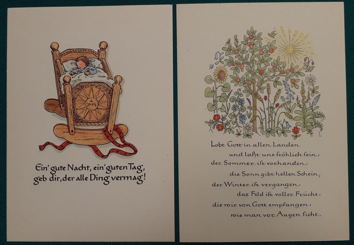 mit den Illustrationen von Es handelt sich um Karten der Serie des Verlages "In Blum und Blüt hüllt Gott sich ein" neu und ungelaufen; minimal an den Kanten bestoßen; sehr guter altersgemäßer Zustand Komplettpreis der 5 Karten: 5 EURO |